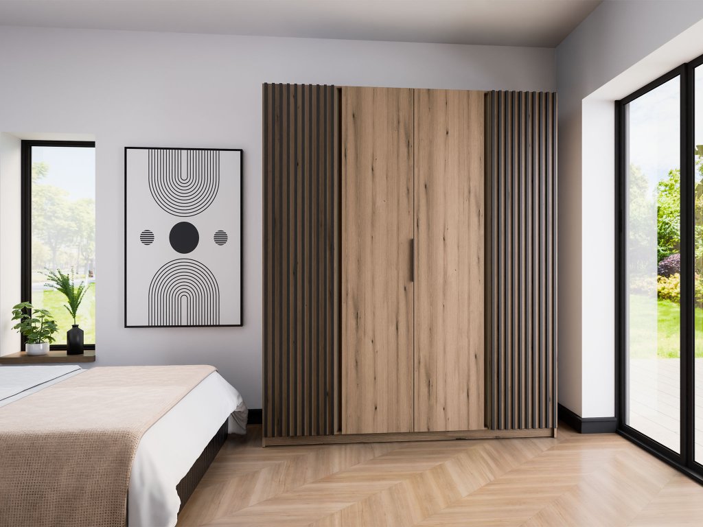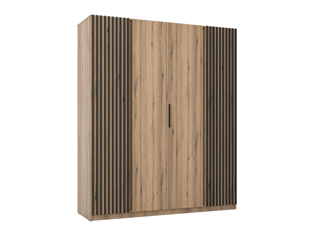 A Kaja négyrészes fa gardróbszekrény ideális megoldás azok számára, akik bőséges tárolóhelyet szeretnének anélkül, hogy kompromisszumot kellene kötniük a dizájn terén. Lenyűgöző, 200 cm-es szélességével elegendő helyet biztosít ágyneműk és szezonális kiegészítők tárolására egyaránt. Univerzális megjelenésének köszönhetően a szekrény könnyedén illeszkedik a különböző enteriőrökbe: hálószobába éppúgy, mint az előszobába. A kiváló minőségű, tartós anyagokból készült szerkezet hosszú távú stabilitást garantál. Az ajtók halk záródása még kényelmesebbé teszi a használatot, elkerülve a felesleges zajokat. A praktikusságot tovább növelik a fekete fém fogantyúk, amelyek nemcsak funkcionálisak, de esztétikailag is vonzóak. Az egyedi karaktert a lamellás dekorációs elem adja, amely különleges megjelenéssel ruházza fel a szekrényt. A belső tér átgondoltan van kialakítva: található benne egy akasztórúd és több tágas polc is.