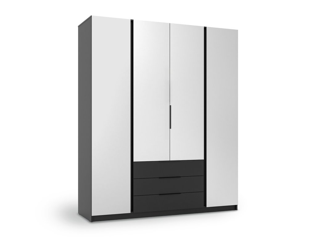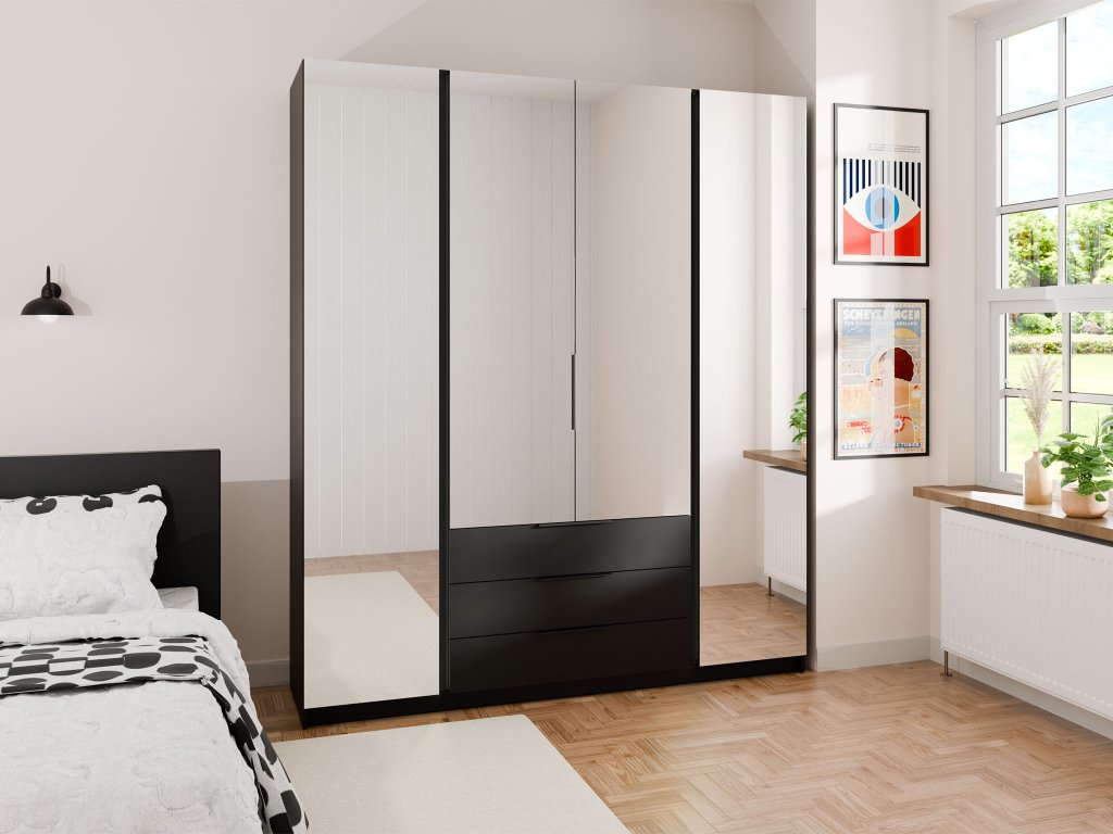 Tágas és elegáns szekrényt keres, amely segít rendet tartani otthonában? A Kaja négyrészes szekrény praktikus bútor ruhák, ágyneműk vagy különféle lakáskiegészítők tárolására. 200 cm szélességével bőséges helyet biztosít, és időtálló, luxus fekete színű dizájnjának köszönhetően bármely helyiségbe, legyen az hálószoba, előszoba vagy más, könnyedén illeszthető. Minden az Ön igényeitől függ. Ez a gardróbszekrény strapabíró anyagokból készült. Négy halk záródású ajtóval rendelkezik, amelyeken fekete fém fogantyúk találhatók. Az ajtók praktikus tükrökkel vannak ellátva, amelyek optikailag tágítják a teret. A szekrény belsejében három tágas fiók, több polc és egy akasztórúd szolgálja a rendet.