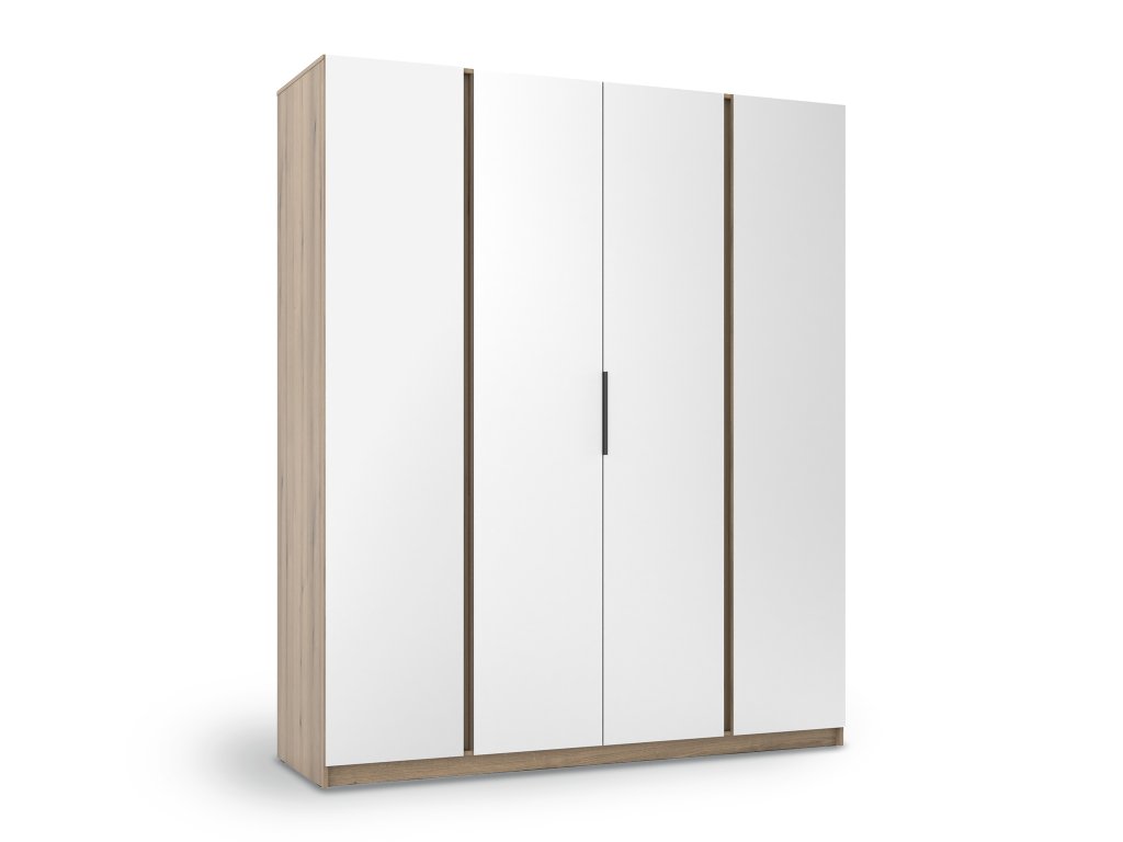A Kaja gardróbszekrény praktikus és stílusos megoldást kínál ruhái, ágyneműi és különféle lakberendezési kiegészítői tárolására. 200 cm-es szélességével elegendő tárolóhelyet biztosít a mindennapi igényekhez. Időtálló kialakítása, amely ötvözi a természetes dekorokat a fekete elemekkel, könnyen illeszkedik bármely helyiségbe, legyen az hálószoba, előszoba vagy otthona más része. A szekrény kiváló minőségű és tartós anyagokból készült, négy halk záródású ajtóval rendelkezik, melyeken az egész felületen tükrök találhatók. Ezek nemcsak elegáns megjelenést kölcsönöznek a szekrénynek, hanem optikailag is megnövelik a helyiség terét. A fekete fém fogantyúk modern hatást keltenek. A belső elrendezés több polcot és akasztórudat kínál a ruhák akasztásához.