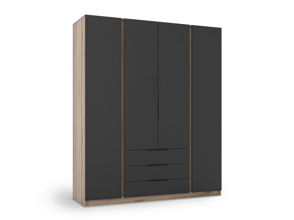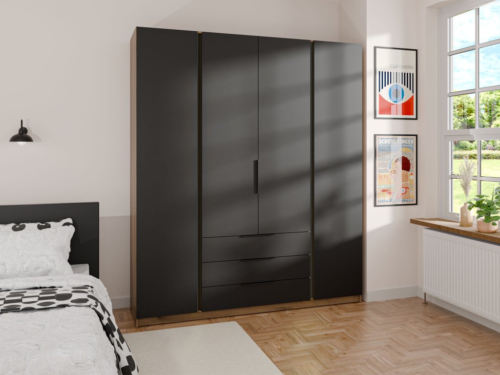A Kaja négyrészes szekrény praktikus megoldást nyújt az előszobába vagy a hálószobába egyaránt. Figyelemre méltó, 200 cm-es szélességének köszönhetően a ruhatár mellett akár felesleges paplanokat, párnákat vagy egyéb lakáskiegészítőket is könnyedén elhelyezhet benne. Kiváló minőségű fából készült, ami hosszú élettartamot és tartósságot biztosít. A szekrény tölgy és fekete színű dekorral készült. Az ajtók halk záródással vannak ellátva és a modern megjelenést erősítő fém fogantyúkkal szereltek. A belső elrendezésben polcokat, akasztórudat és három tágas fiókot talál.