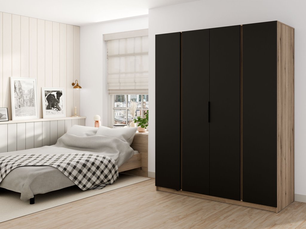 A Kaja szekrény kiváló megoldás mindazok számára, akik stílusos bútort és praktikus tárolóhelyet keresnek. Szélessége eléri a 200 cm-t, így bőséges helyet kínál ruhái, szezonális holmijai vagy egyéb lakáskiegészítők elhelyezésére. A tölgy dekor és fekete részletek kombinációjának köszönhetően könnyedén beilleszthető bármilyen enteriőrbe, legyen szó hálószobáról, előszobáról vagy otthonának bármely más helyiségéről. Ez a gardróbszekrény négy ajtóval rendelkezik, amelyek mögött praktikus belső elrendezést talál: több polc és egy akasztórúd gondoskodik a rendszerezett tárolásról.