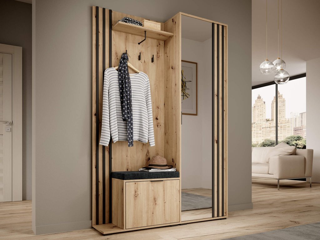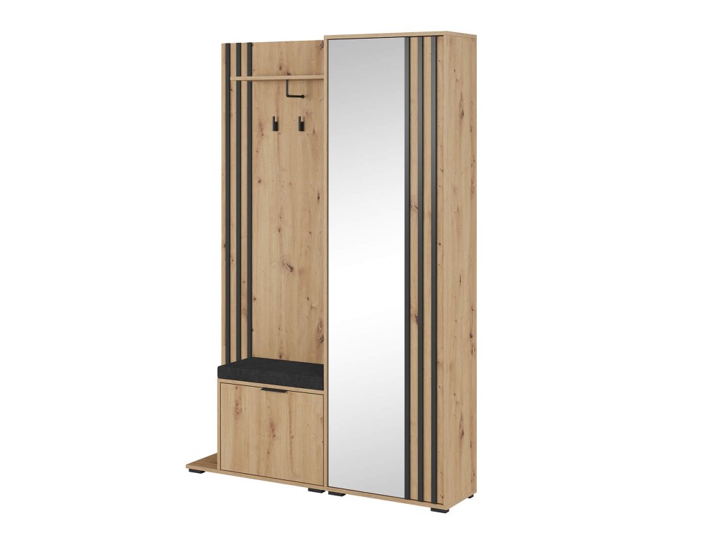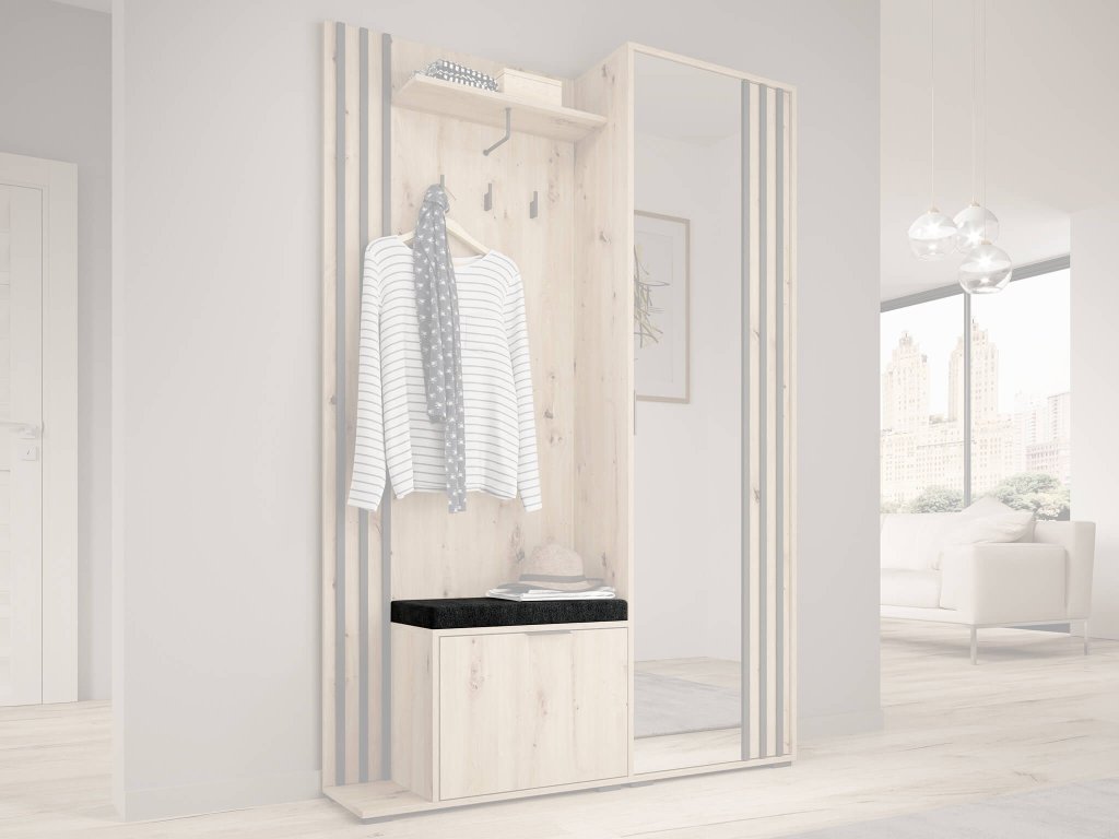 Kárpitozott párna a NELLY előszobafalhoz, amely tökéletes és kényelmes helyet biztosít az öltözködéshez és a cipő felhúzásához. A cipősszekrény így nem csak a cipők, sálak és kesztyűk tárolására szolgál, de padként is.