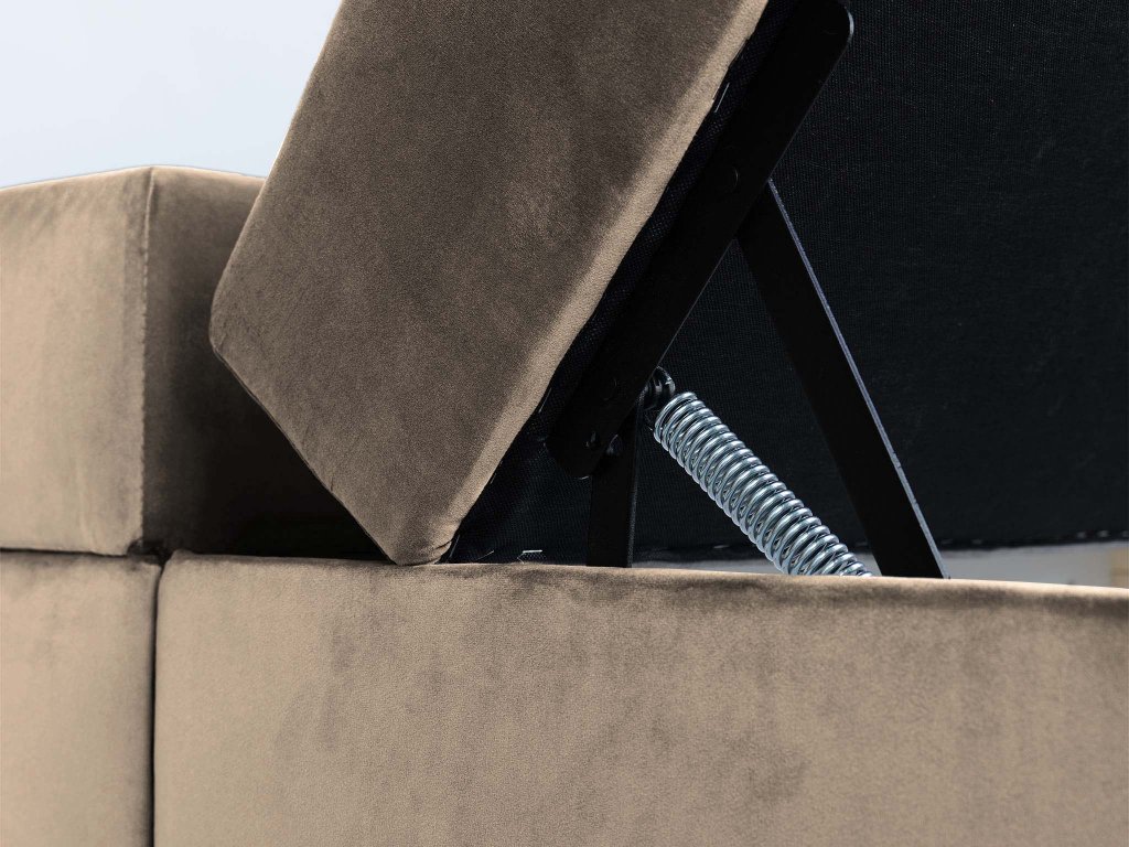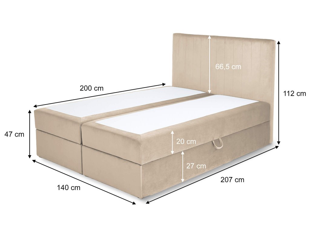 A boxspring ágy váza minőségi tömör fából és laminált forgácslapból készült. Az ágy háttámlája szintén tömör fa, a kényelmet biztosító hab pedig gyönyörű Royal Velvet szövettel van kárpitozva. Az ágytámla nagyon stabil és kényelmesen neki tud támaszkodni olvasás vagy tévénézés közben. Ez a franciaágy tökéletes választás minden hálószobába. Az ágy két 20 cm vastag kényelmes matraccal együtt kapható. Az ágyhoz tartozik továbbá még egy beépített ágyrács is. Az egész ágy bézs Royal Velvet szövettel kárpitozott, amely nagyon puha és kellemes tapintású. A szövet nem bolyhozódik és Martindale teszt szerinti ellenálló képessége a kikopással szemben: > 100 000 ciklus.