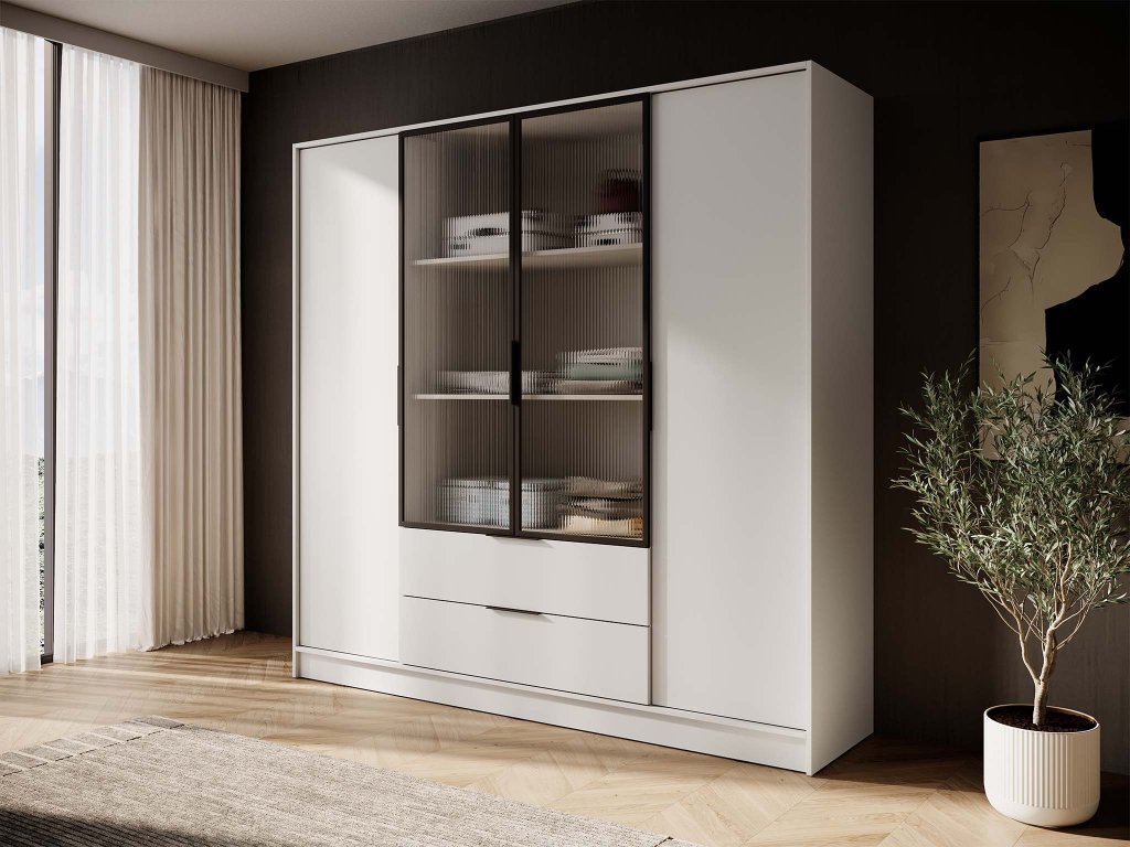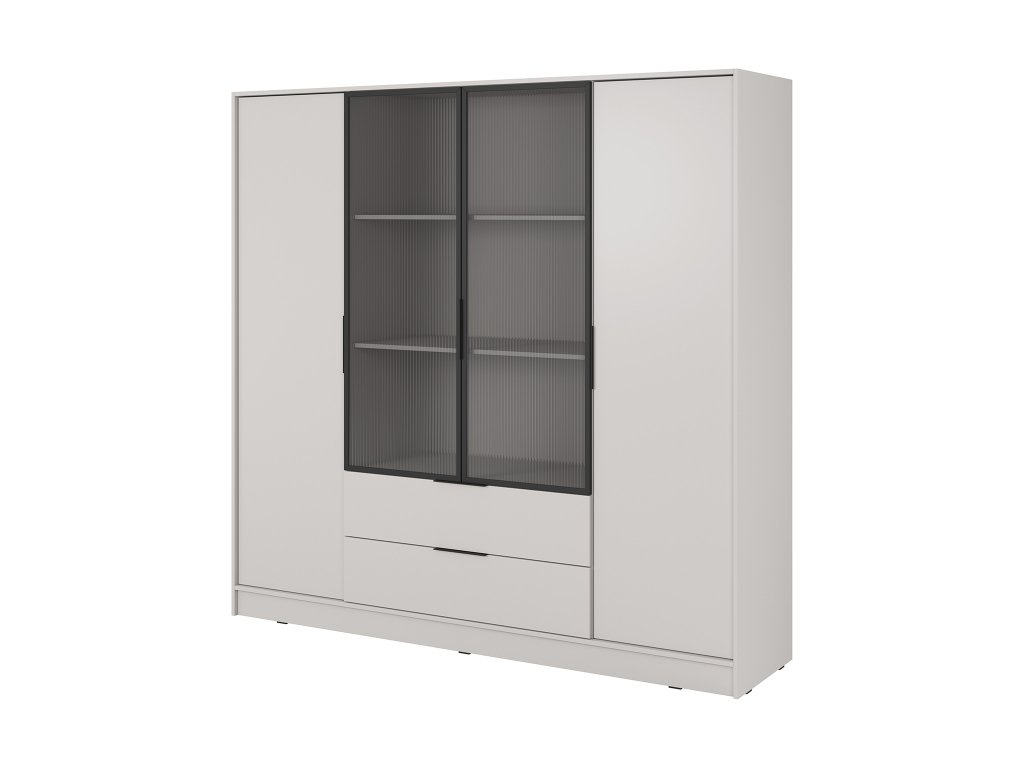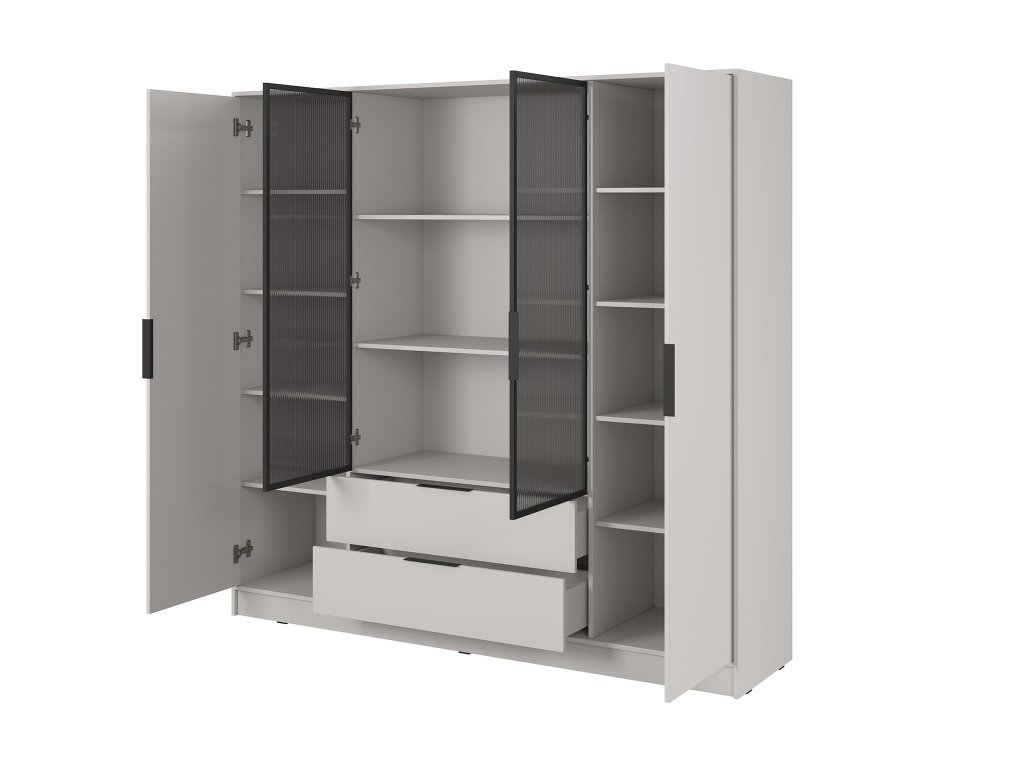 Számos polccal és fiókkal is rendelkező KELLY 200 4D-RM négyajtós kasmír gardróbszekrény a stílusos otthonokba. A két oldalsó egyajtós szekrény polcokat tartalmaz, amelyeknek köszönhetően könnyen rendet tarthat a ruhásszekrényében. Középső részében két tágas fiók található, felettük pedig egy kétajtós szekrény található gyönyörű bordázott üvegajtókkal, amely egy két széles polcot rejt. A szekrény 16 mm vastag laminált bútorlapból készült, és ABS élekkel van biztosítva a hosszabb élettartam érdekében. A fekete fogantyúk nemcsak megkönnyítik a nyitást, hanem kiemelik a bútor modern megjelenését. Jó választást jelenthet a hálószobájába vagy a nappalijába is.