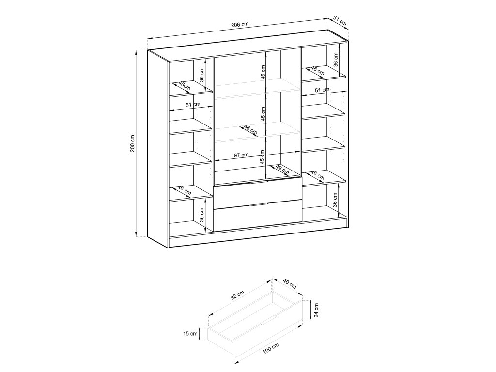 - Anyaga: laminált bútorlap (16 mm), ABS élek (0,5 mm), fém akasztórúd, golyós vezetősínek
