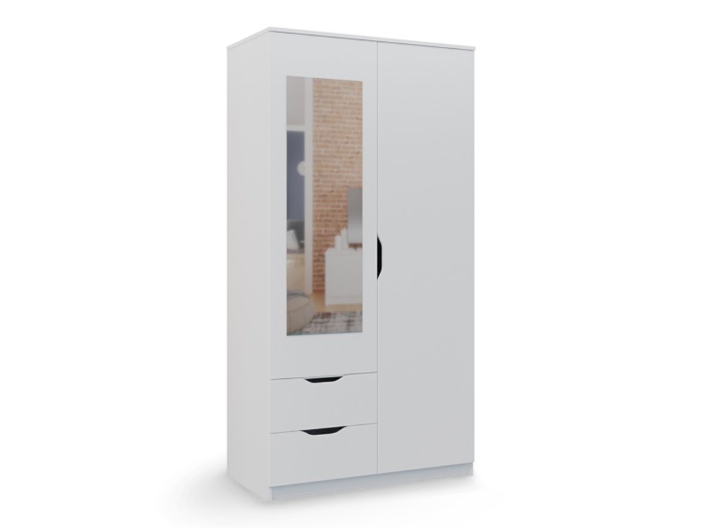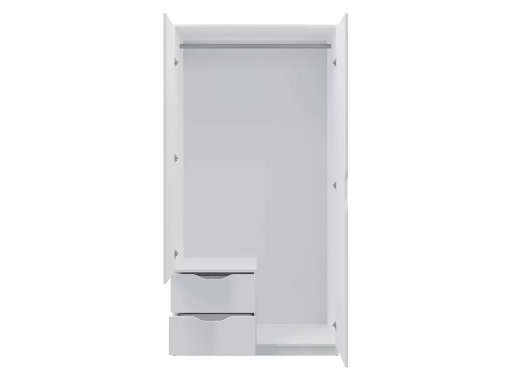 A kétajtós ruhásszekrény minőségi 16 mm vastag laminált forgácslapból készült, amely garantálja az ellenálló képességét és a könnyű karbantartását. Két fiókkal és az ajtók mögött egy akasztórúddal rendelkezik, amely elegendő helyet biztosít a dolgok tárolására. A fiókokon elegáns kivágott részek találhatók, amelyek fogantyúként funkcionálnak. Ennek köszönhetően a komód igazán minimalista és letisztult stílussal rendelkezik. A szélei ABS furnérral biztosítottak, amely megvédi a bútort a sérülésektől. A standard vezetősínek garantálják a fiókok sima és gördülékeny használatát.