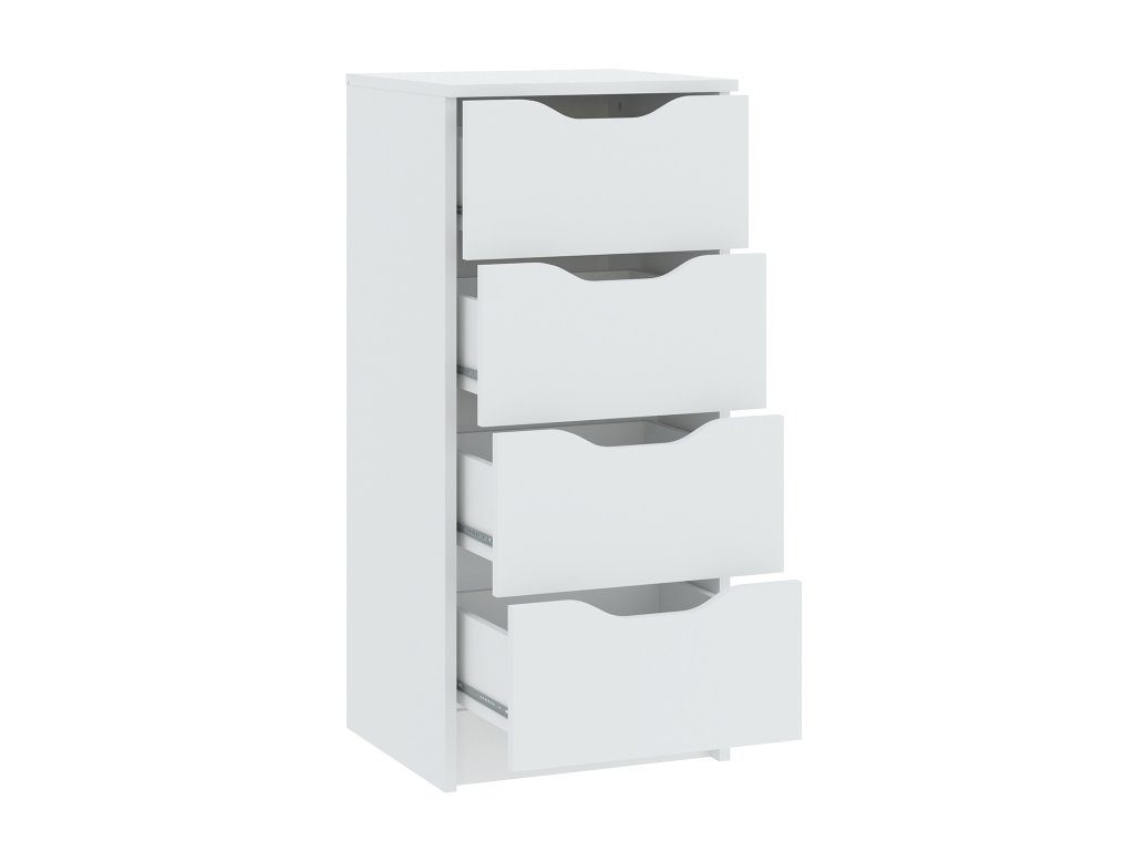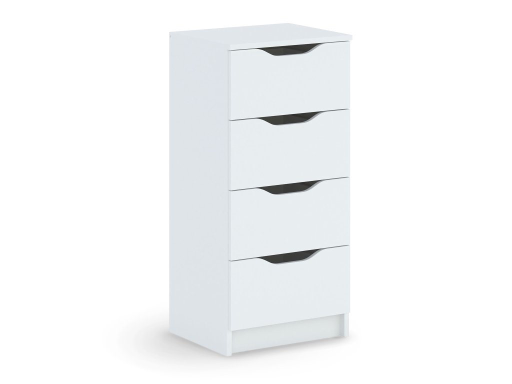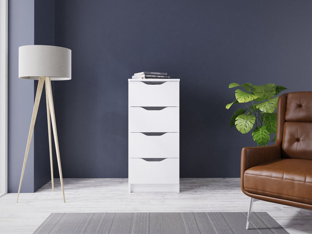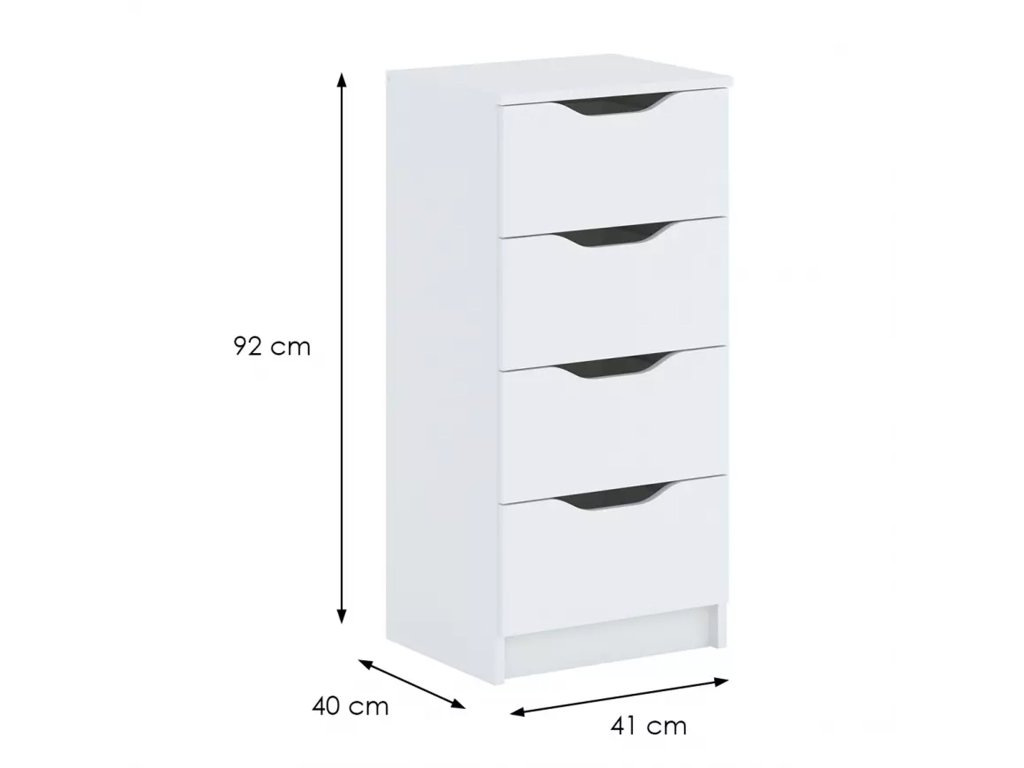 A keskeny komód minőségi 16 mm vastag laminált forgácslapból készült, amely garantálja az ellenálló képességét és a könnyű karbantartását. Négy fiókkal rendelkezik, amely elegendő helyet biztosít a kisebb dolgok tárolására. A fiókokon elegáns kivágott részek találhatók, amelyek fogantyúként funkcionálnak. Ennek köszönhetően a komód igazán minimalista és letisztult stílussal rendelkezik. A szélei ABS furnérral biztosítottak, amely megvédi a bútort a sérülésektől. A standard vezetősínek garantálják a fiókok sima és gördülékeny használatát.