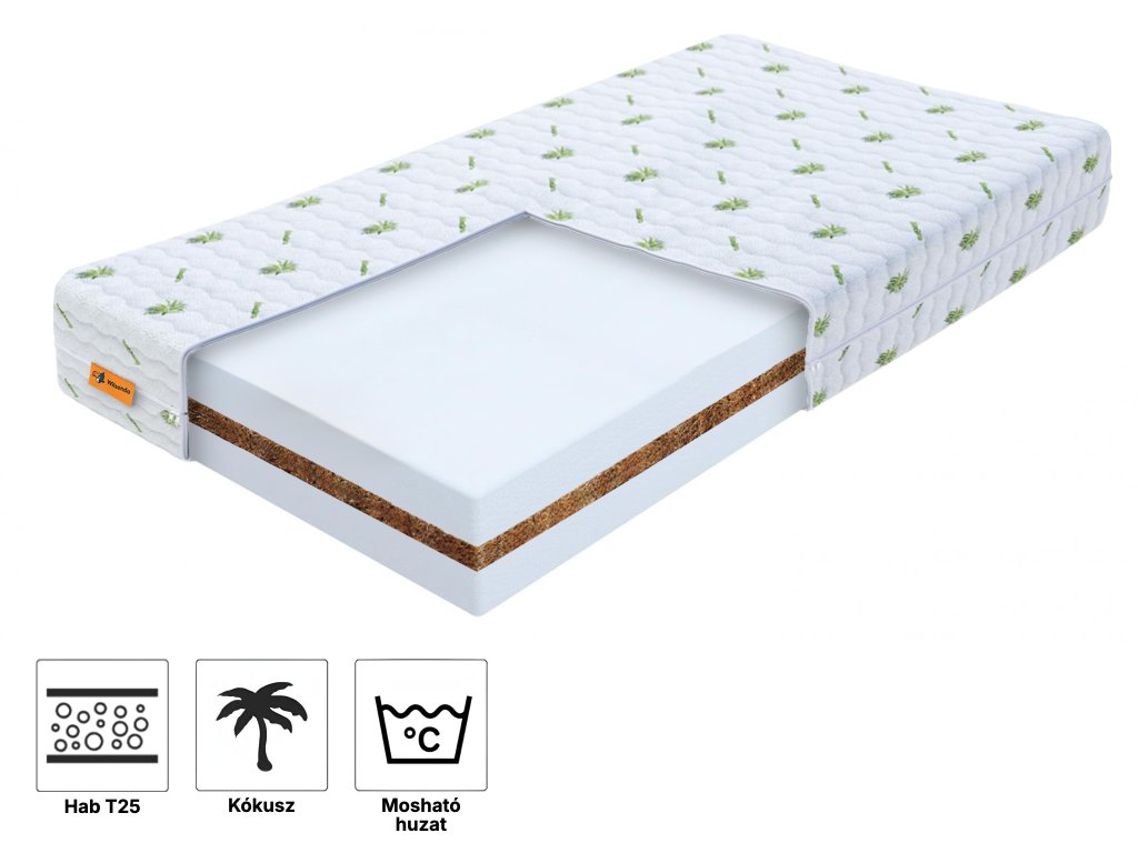 Biztosítsa gyermekének azt a kényelmet, amely támogatja az egészséges növekedést és a pihentető alvást! A Kókusz Plus 80x180 cm-es gyerekmatracot úgy tervezték, hogy figyelembe vegye a gyermek testének igényeit a megfelelő alátámasztás, a tisztaság és a puha anyagok terén. Kétoldalas, háromrétegű felépítése kiegyensúlyozott kombinációt nyújt természetes és tartós összetevőkből, így hosszú távon is megbízható használatot biztosít. A középső kókuszréteg megfelelő szilárdságot ad a matracnak, kiválóan elvezeti a nedvességet, és természetes módon gátolja a baktériumok elszaporodását. Ez az ökológiai és jól szellőző anyag tovább növeli az éjszakai higiénia szintjét. A felső és alsó réteg T25 poliuretán habból készül, amely ismert formastabilitásáról és tartósságáról még intenzív használat mellett is.