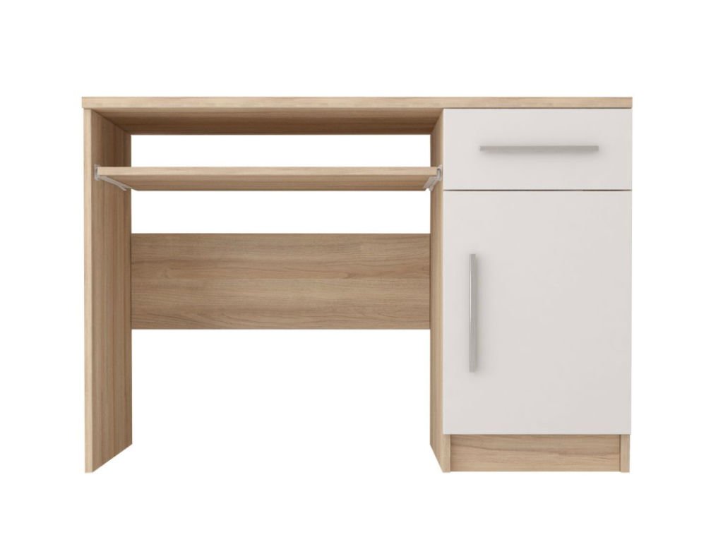 Matt fehér és sonoma tölgy kombinációjában készült KORNIA íróasztal, amely két polccal rendelkezik a szekrény részben. Az írófelület alatt egy nyitott polc található a könyveknek és a füzeteknek, továbbá egy fiók. Az asztal íróasztalként vagy számítógépes asztalként is használható.