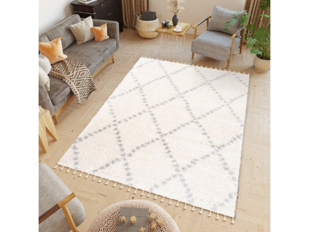 A geometrikus mintával díszített APACH puha shaggy szőnyeg remek választás minden otthonba. Tökéletes nappali, hálószoba vagy gyerekszoba szőnyeg. De az ifjúsági szobában is megállja a helyét. A szőnyeg a geometrikus minta mellett apró bojtokkal is díszítve van. Ez a pihe - puha hosszú szálú szőnyeg az otthon melegét viszi minden szobába, ahová csak elhelyezi.