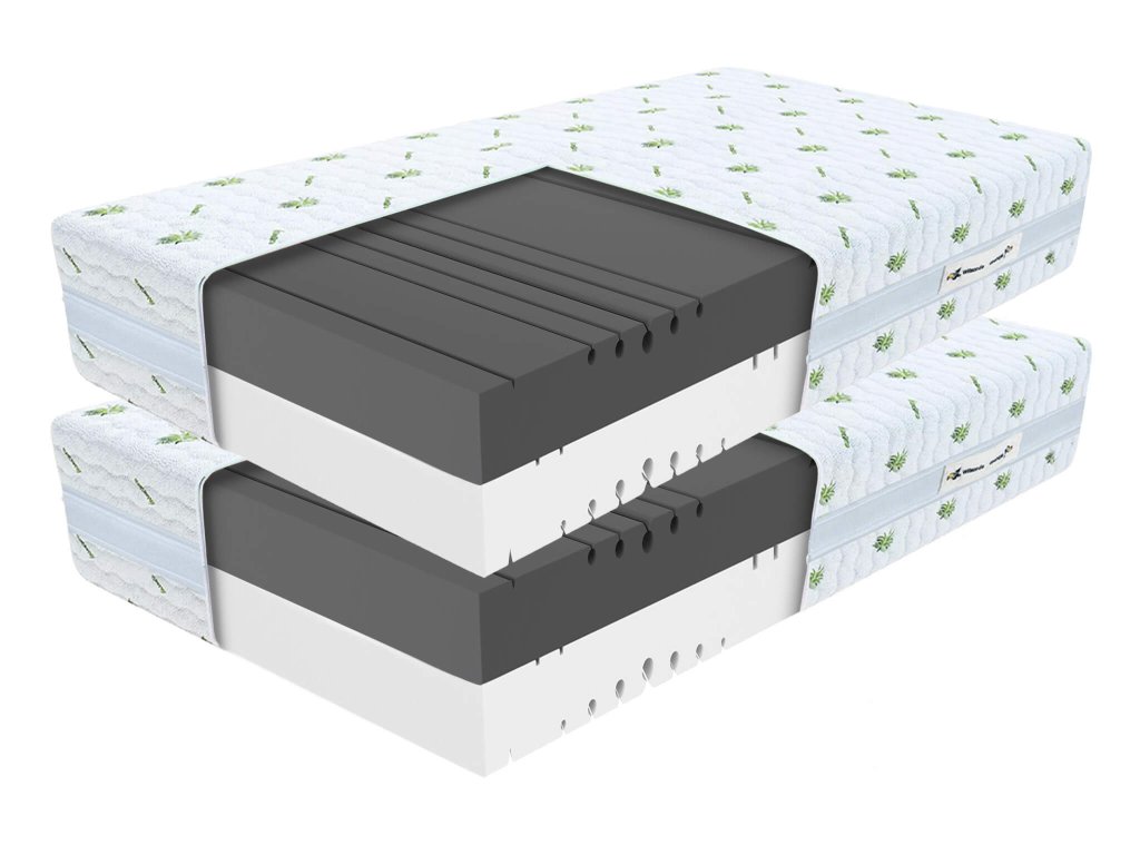Akciós csomagolásban kedvezményes áron kapható 80x200 cm méretben két matrac. A matracok franciaágyba vagy gyerekszobai ágyakba megfelelőek. A két hab olyan tulajdonságokkal rendelkezik, melyek az Ön testének tökéletes alátámasztását biztosítják. A Kruela matrac 200x80 7 zónába van osztva, ennek köszönhetően könnyen alkalmazkodik a test formájához. Mindegyik zóna a test bizonyos részének nyújt alátámasztást. A matracban kialakított csatornák nem csak a kényelmet befolyásolják használat közben, de nagyban hozzájárulnak a jobb légáramláshoz, védenek a penész és gombák kialakulásától. A matrac kétoldalas. Mindegyik oldala eltérő keménységet kínál. A 25 kg/m3 sűrű poliuretán hab kiváló hőizolációt nyújt. A minőségi hab kiváló támaszt biztosít a hátgerincnek. Nem deformálódik, ennek köszönhetően rendkívül kényelmes, alvás közbeni kényelmet biztosít. A felhasznált HR hab különböző struktúrájú cellákból tevődik össze, így könnyebben alkalmazkodik a test formájához.