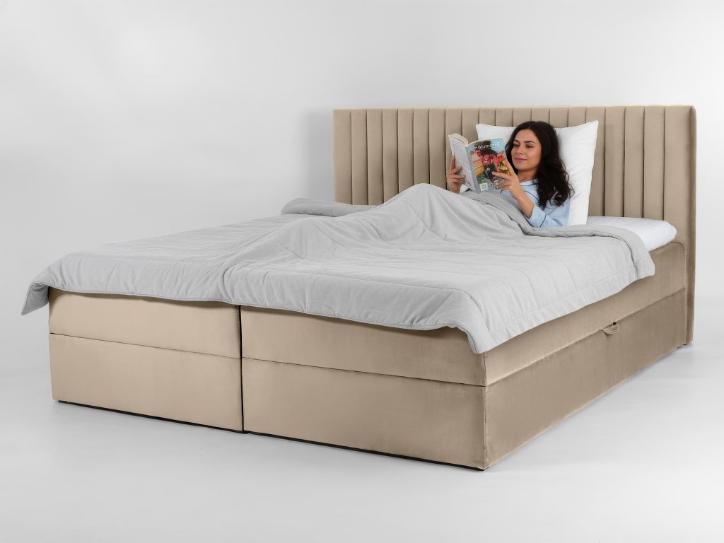 A LAMELLA boxspring franciaágy luxust és maximális komfortot nyújt használójának. Masszív szerkezettel, kényelmes magassággal és nagy tárolóhellyel rendelkezik. A bézs árnyalatban gyártott kárpitozott ágy időtálló és jól illeszkedik más színekhez, ugyanakkor növeli a teret. A LAMELLA kontinentális ágy egyik fő előnye a praktikus oldalra nyíló ágyneműtartó, amely bőséges tárolóhelyet biztosít. Az ágykeret tömörfa és laminált forgácslap keverékéből tevődik össze. Az 5 cm vastag tömörfából készült, steppelt fejtámlát T25 hab tölt ki, ezáltal stabil és tartós marad a használat során. A LAMELLA franciaágy beépített ágyráccsal és matraccal is rendelkezik. Az ágybetétet magas pontrugalmasság és ellenálló képesség jellemzi. Tökéletesen alátámasztja a gerincet, a csípőt és a vállakat köszönhetően a 9 zónás bonellrugós kialakításnak.
