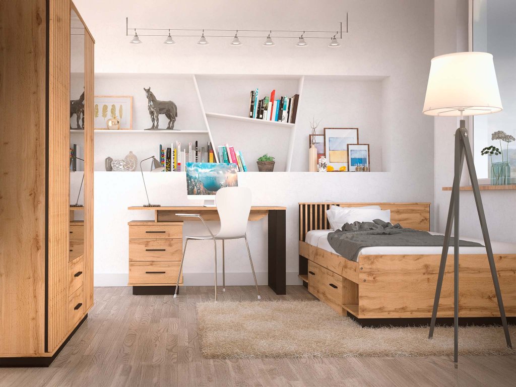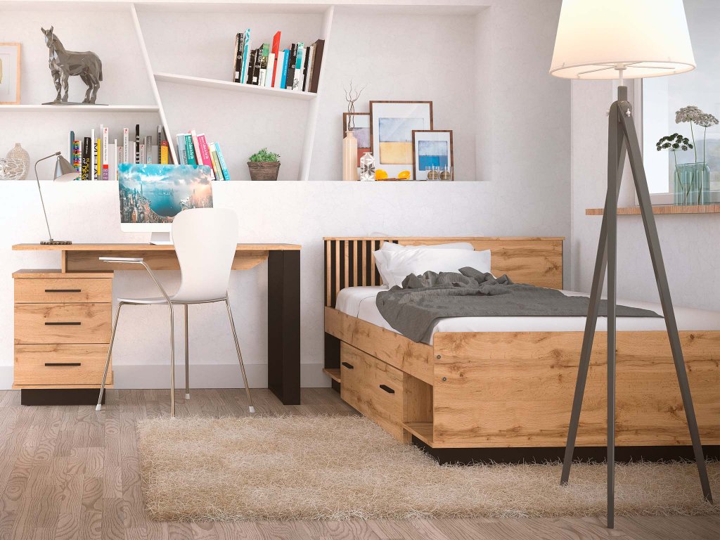 Engedje meg, hogy bemutassuk a LAMELO 120 x 200 m egyszemélyes ágyunkat, amely tökéletes választás lehet a vendégszobába vagy a gyerekszobába is. Az ágy praktikus ágyneműtartó fiókkal is rendelkezik, ahová elhelyezheti az ágyneműt vagy a szezonális ruhákat. A tároló fiók mellett pedig két nyitott polccal is el van látva az ágy. Wotan tölgy és fekete szín kombinációjában készül, így modern és stílusos hatást kelt, amely megfelelő választás lehet különböző stílusú szobákba. Gyönyörű és praktikus lamellákkal díszített ágytámlával díszített, amely hasznos lehet olvasás vagy tévénézés közben. Ez az ágy nem csak stabil, strapabíró és ellenálló, de igazán impozáns és lenyűgöző látványt is nyújt. Az ágyhoz fából készült léces ágyrács is tartozik, amely biztosítja majd a kényelmét és a matrac hosszú élettartamát. Az ágyhoz tökéletes választás a Lamelo éjjeliszekrény.