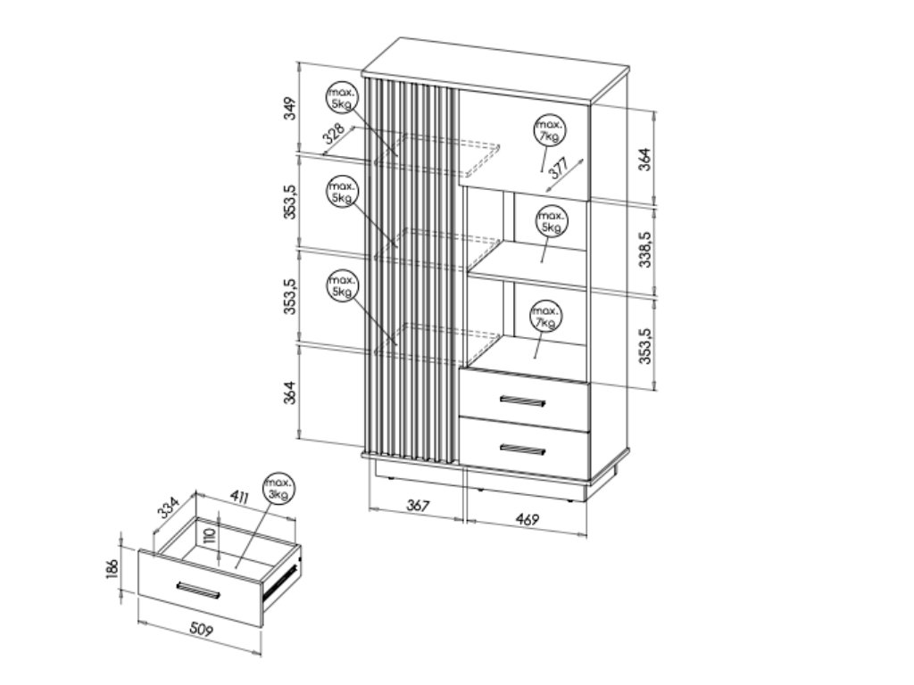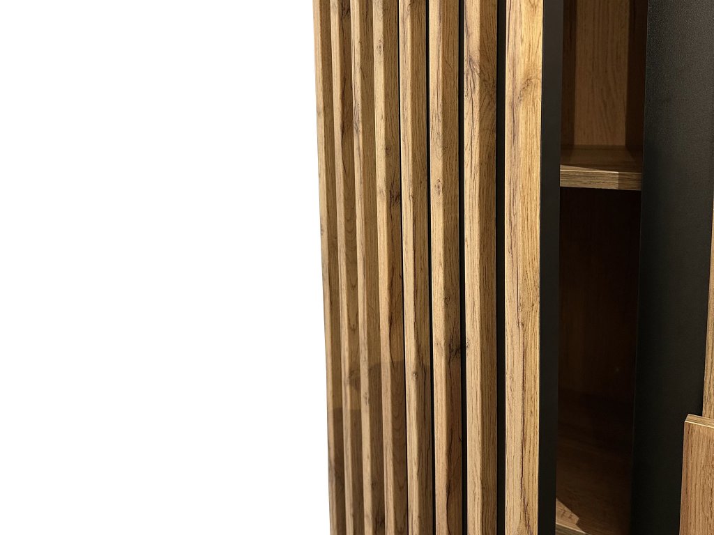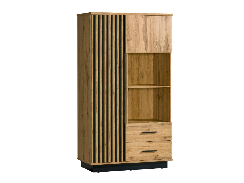 LAMELO polcos szekrény - amely két részre van osztva. A bal oldalában két fiókot helyeztek el, fölötte pedig két nyitott polcot, amelyek könyvespolcként is használhatóak. A jobb oldalon lamellákkal díszített ajtó található, amely mögött 3 polc helyezkedik el.