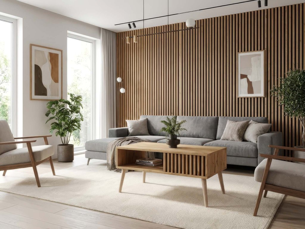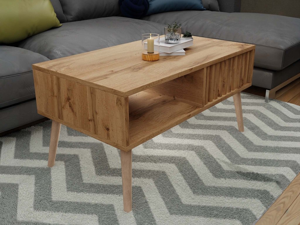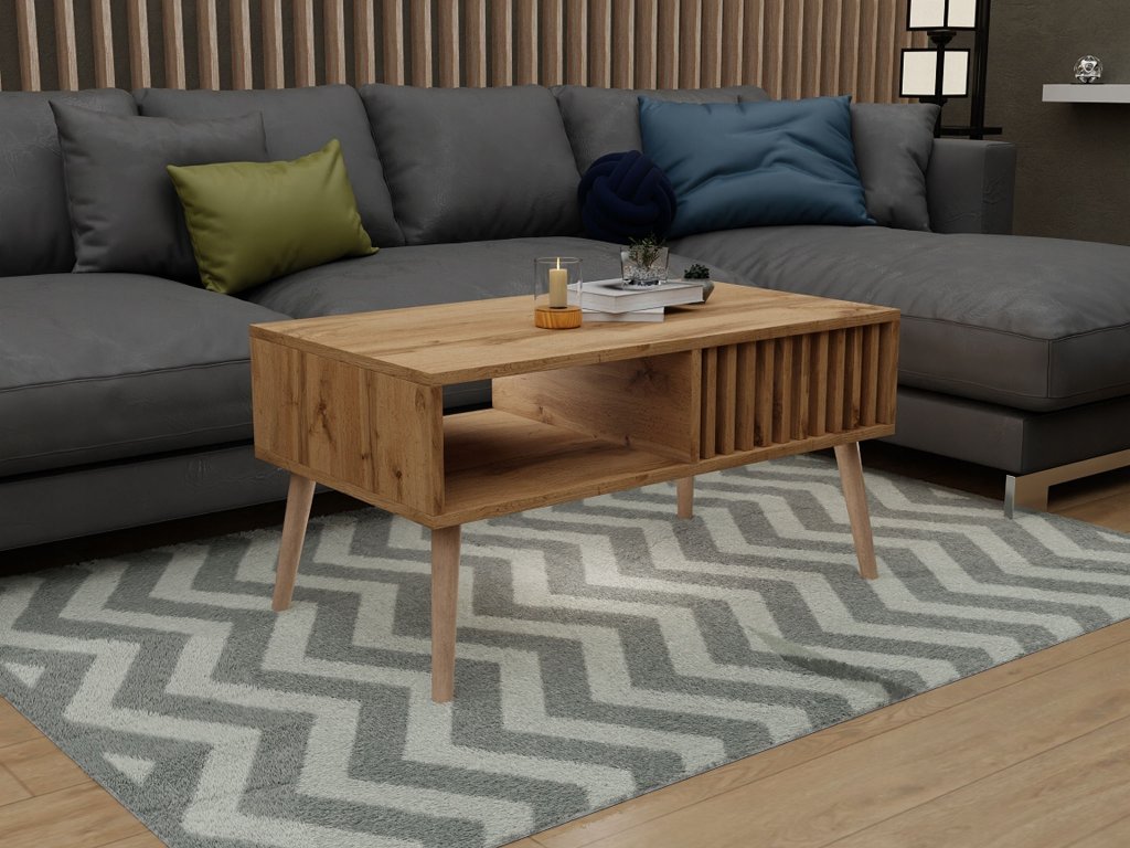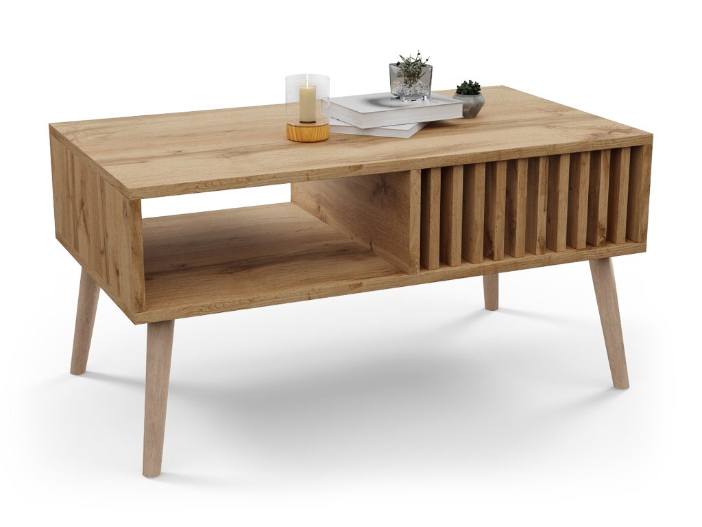 A Lameo modern konferenciasztal ideális választás minden nappaliba, amely skandináv vagy modern stílusban van berendezve. Könnyen összehangolható a kanapéval, nappali fallal vagy a szoba egyéb kiegészítőivel. Kiváló minőségű lamellás deszkából készült tölgy wotan dekorációval, amely kiemelkedik meleg természetes tónusával. Az asztal praktikus téglalap alakú, és az oldalsó lamellák egyedi, tiszta dizájnt kölcsönöznek neki. Elegáns, mégis elég modern ahhoz, hogy a belső tér kiemelkedő eleme legyen. Rendelkezik egy alsó tároló polccal is, ahová könyveket, magazinokat, távirányítókat vagy dekorációkat lehet elhelyezni, amelyeket mindig kéznél szeretne tartani. A Lameo asztal karbantartása egyszerű - elég nedves ruhával áttörölni vagy általános bútor tisztítószert használni. Ez az asztal így esztétikát, praktikusságot és időtálló dizájnt egyesít egyben.