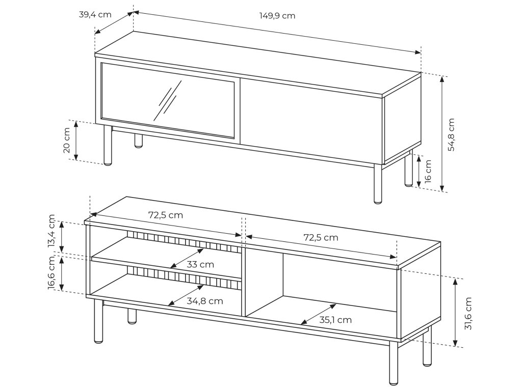 - Anyaga: 16 mm vastag laminált bútorlap 0,5 cm ABS furnérral, MDF, edzett üveg, tömör fa lábak