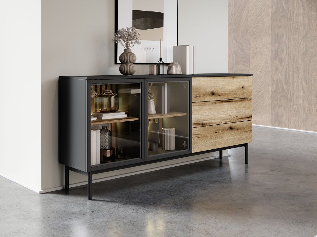LANGO 180 vitrines komód - fekete/evoke tölgy
