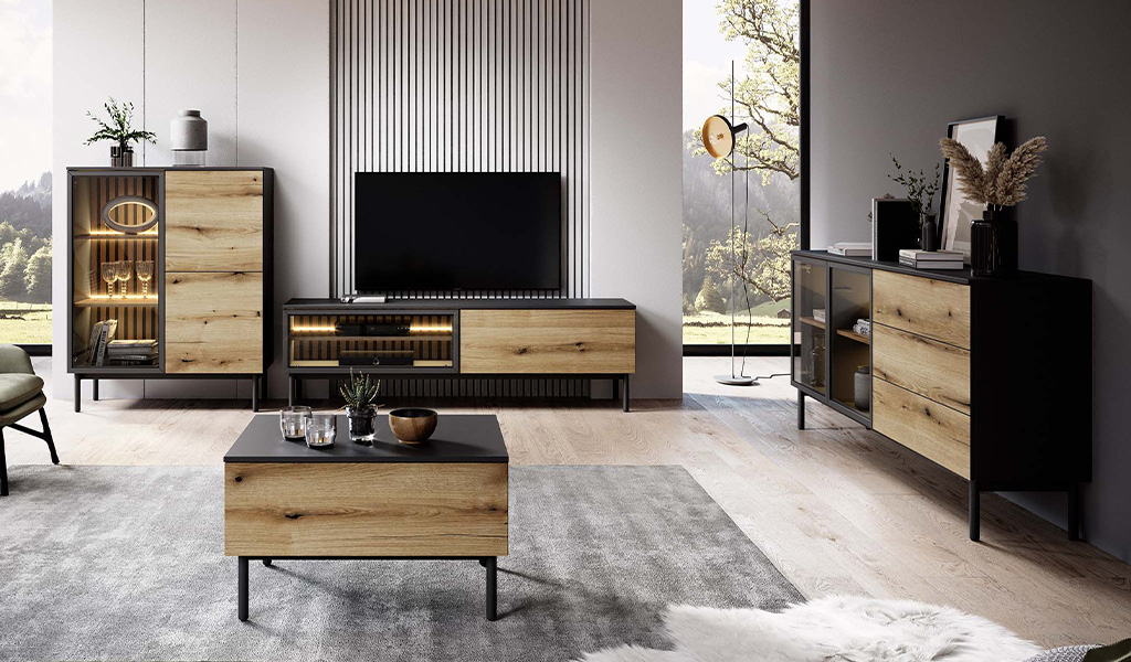 A nappali kollekció a minőségi kidolgozottságra és a mindennapi praktikus használatra épül. A bútorok laminált bútorlapból készülnek, ellenálló ABS élzárással, a fiókok golyóscsapágyas, teljes kihúzású fióksínekkel működnek, amelyek halk és sima mozgást biztosítanak. A stabil szerkezetet és a modern megjelenést a fekete fa lábak teszik teljessé, amelyek könnyedséget és elegáns összhatást kölcsönöznek az egyes daraboknak.
