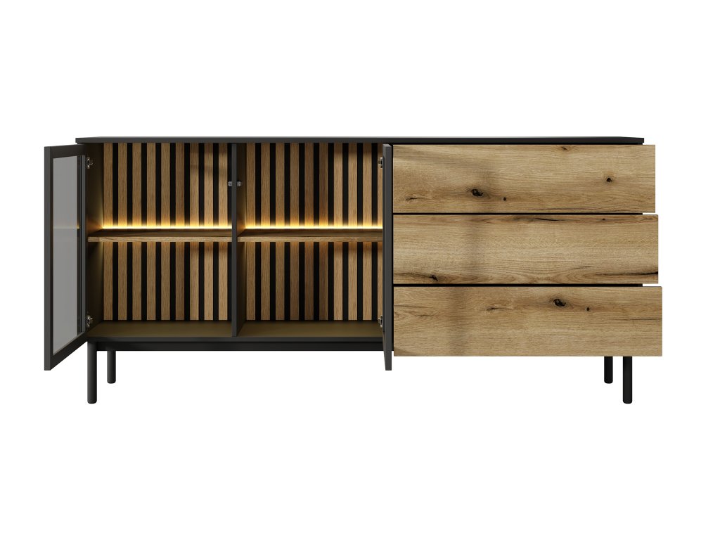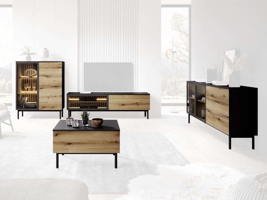 A LANGO nappali bútor garnitúra tökéletes választás mindazoknak, akik modern, elegáns és egyben praktikus bútorokat keresnek. A fekete bútortest és az evoke tölgy színű előlapok harmonikus kontrasztot alkotnak, amely bármely nappaliban igazán jól mutat. A jellegzetes lamellák, a finom MDF keretek és a füstös edzett üvegből készült ajtók különleges megjelenést biztosítanak, és kiemelik a kollekció modern karakterét. A bútorcsalád legtöbb eleme beépített LED világítással rendelkezik, amely kellemes hangulatot teremt – főleg az esti órákban – és szépen kiemeli a felületek textúráját. A letisztult, minimalista megjelenést tovább erősíti a push-to-open nyitási rendszer, amely itt teljesen leváltja a hagyományos fogantyúkat, így a bútorok kinyitása kényelmes és egyszerű. A nappali kollekció a minőségi kidolgozottságra és a mindennapi praktikus használatra épül. A bútorok laminált bútorlapból készülnek, ellenálló ABS élzárással, a fiókok golyóscsapágyas, teljes kihúzású fióksíneken mozognak, amelyek halk és sima mozgást biztosítanak. A stabil szerkezetet és a modern megjelenést a fekete fa lábak teszik teljessé, amelyek könnyedséget és elegáns összhatást kölcsönöznek az egyes daraboknak.
