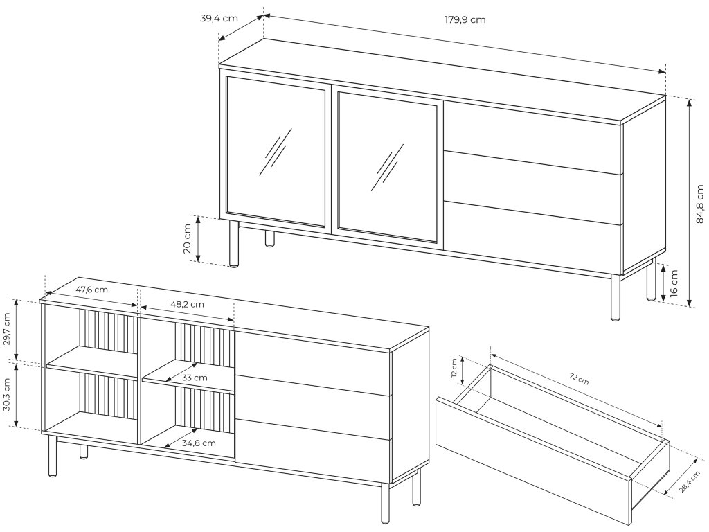 Méret (SzéxMaxMé): 80,1 x 48,4 x 60,1 cm - LANGO 180 komód - számos tárolóhelyet biztosít a kétajtós üveges szekrénynek és a fiókoknak köszönhetően.