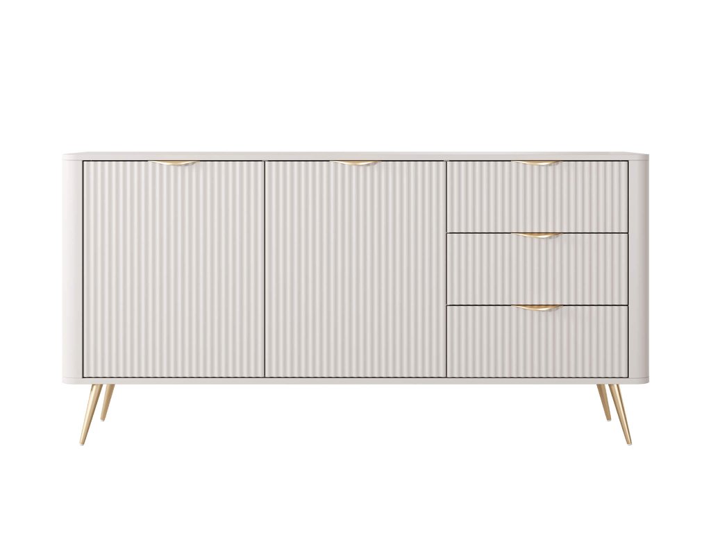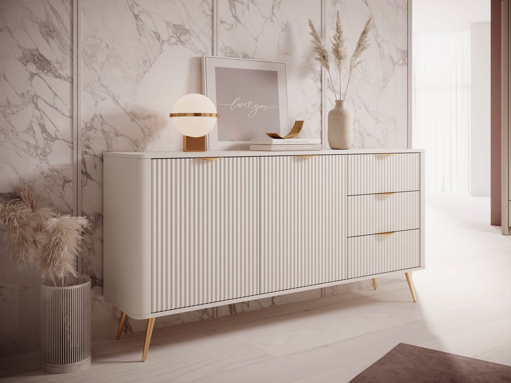 Az egyedi LANTE bútor kollekció harmonikus hangulatot teremt otthonában. A kellemes bézs szín szinte azonnal magára vonja a figyelmet csakúgy, mint a szokatlan, barázdált bútorelőlap. A semleges árnyalat az aranyszínű lábakkal együtt eleganciát visz otthonába. A LANTE bútorok mindegyike lekerekített élekkel rendelkezik, ami kellőképpen biztonságossá teszi a használatot. A dekoratív bútorfrontok különleges designt kölcsönöznek ezeknek a bútoroknak. A nyitást finom aranyszínű fogantyúk biztosítják. Kiváló minőségű anyagok felhasználásával készült nappali elemes bútorok, melyek bézs színű HDF bútor hátlappal rendelkeznek. A modern minimalista bútorok tökéletesen illeszkednek a nappaliba, hálószobába vagy akár a dolgozószobába is. Tegye otthonát elragadóvá a LANTE bútorösszeállítással.