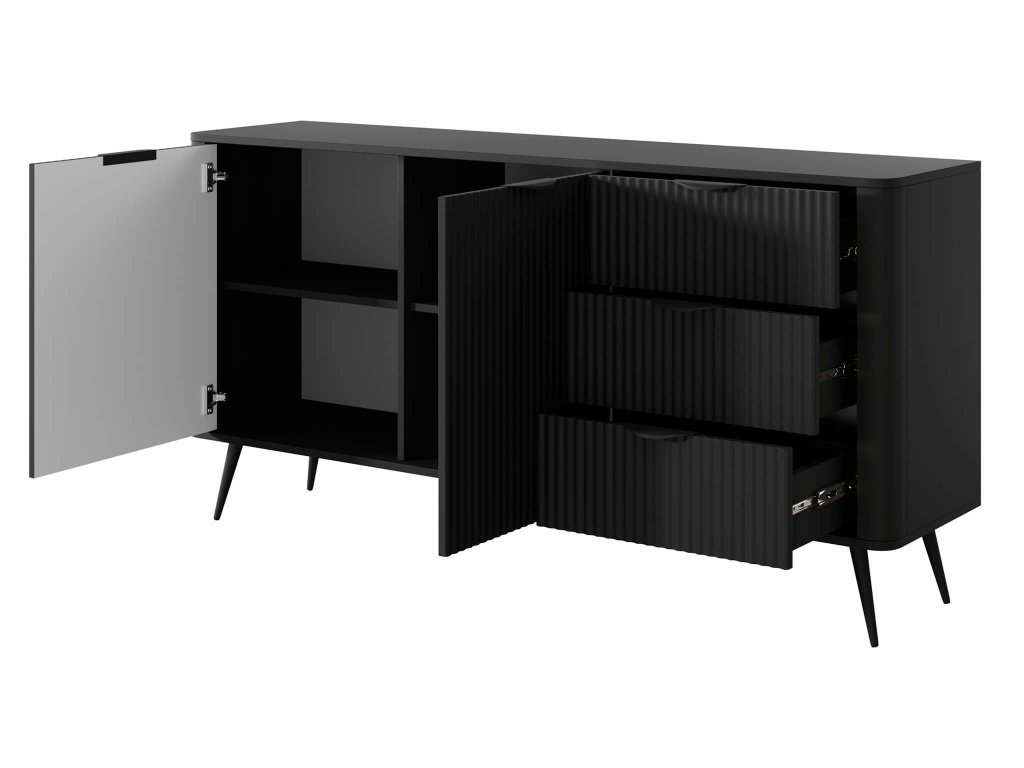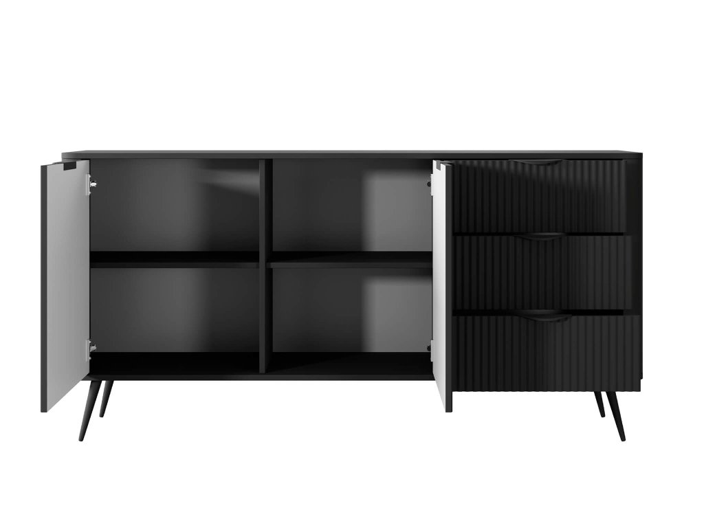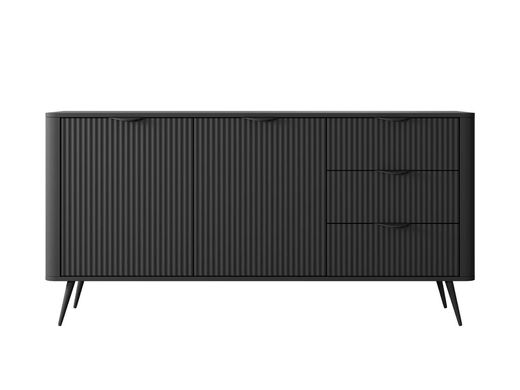 Az egyedi LANTE bútor kollekció harmonikus hangulatot teremt otthonában. Az elegáns fekete szín szinte azonnal magára vonja a figyelmet csakúgy, mint a szokatlan, barázdált bútorelőlap. A semleges árnyalat a fekete fém lábakkal együtt előkelőséget visz otthonába. A LANTE bútorok mindegyike lekerekített élekkel rendelkezik, ami kellőképpen biztonságossá teszi a használatot. A dekoratív bútorfrontok különleges designt kölcsönöznek ezeknek a bútoroknak. A nyitást diszkrét fekete fogantyúk biztosítják. Kiváló minőségű anyagok felhasználásával készült nappali elemes bútorok, melyek HDF bútor hátlappal rendelkeznek. A modern minimalista bútorok tökéletesen illeszkednek a nappaliba, hálószobába vagy akár a dolgozószobába is. Tegye otthonát elragadóvá a LANTE bútorösszeállítással.