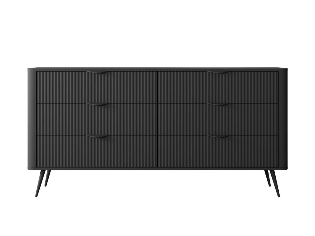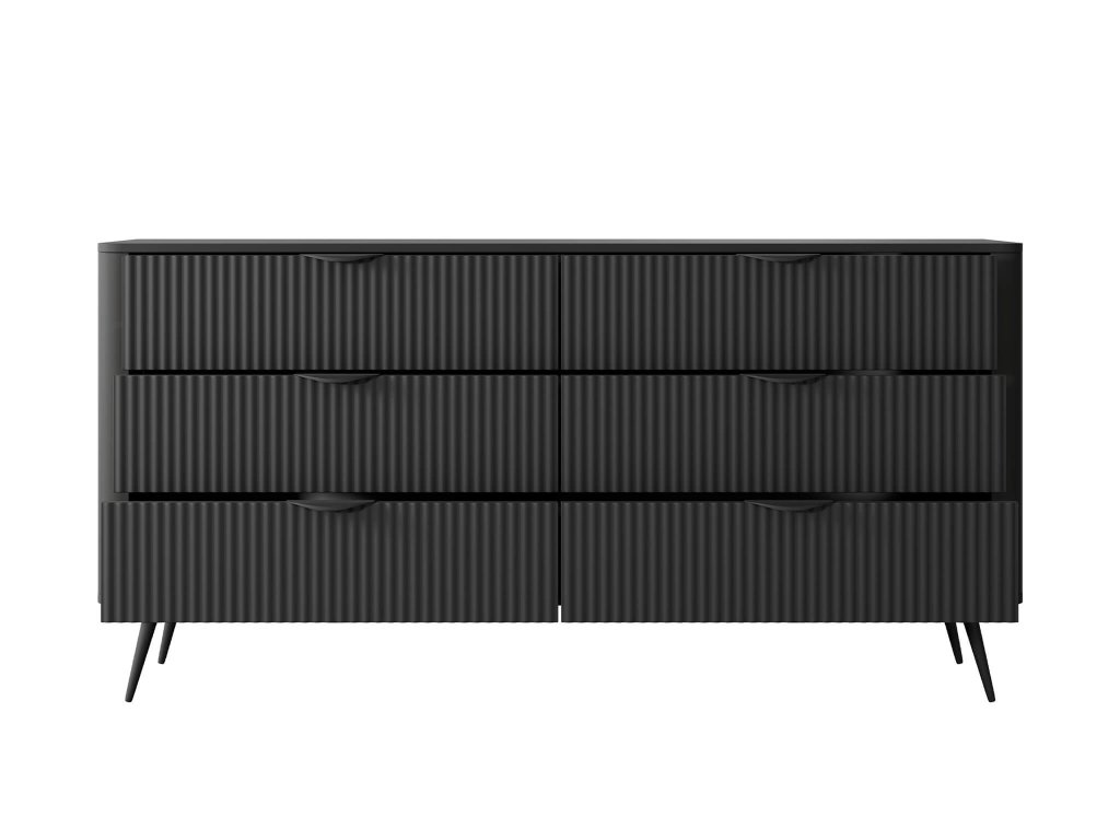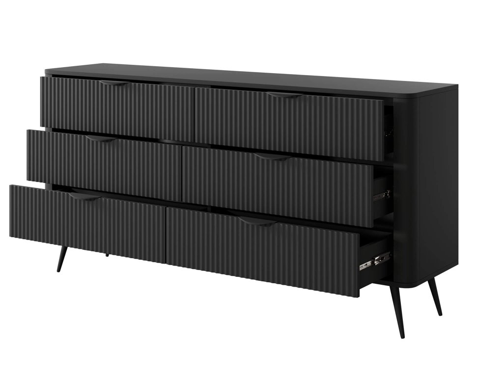 A LANTE 163 6s tágas komód 6 praktikus fiókkal rendelkezik. A fiókok bőséges tárolóhelyet biztosítanak azoknak a dolgoknak, amelyeket nem szeretne szem előtt tartani. Segítenek rendet és áttekinthetőséget tartani otthonában. Az elegáns fekete szín különböző kanapé típusokhoz illik, Önnek már csak ki kell választani a megfelelőt.