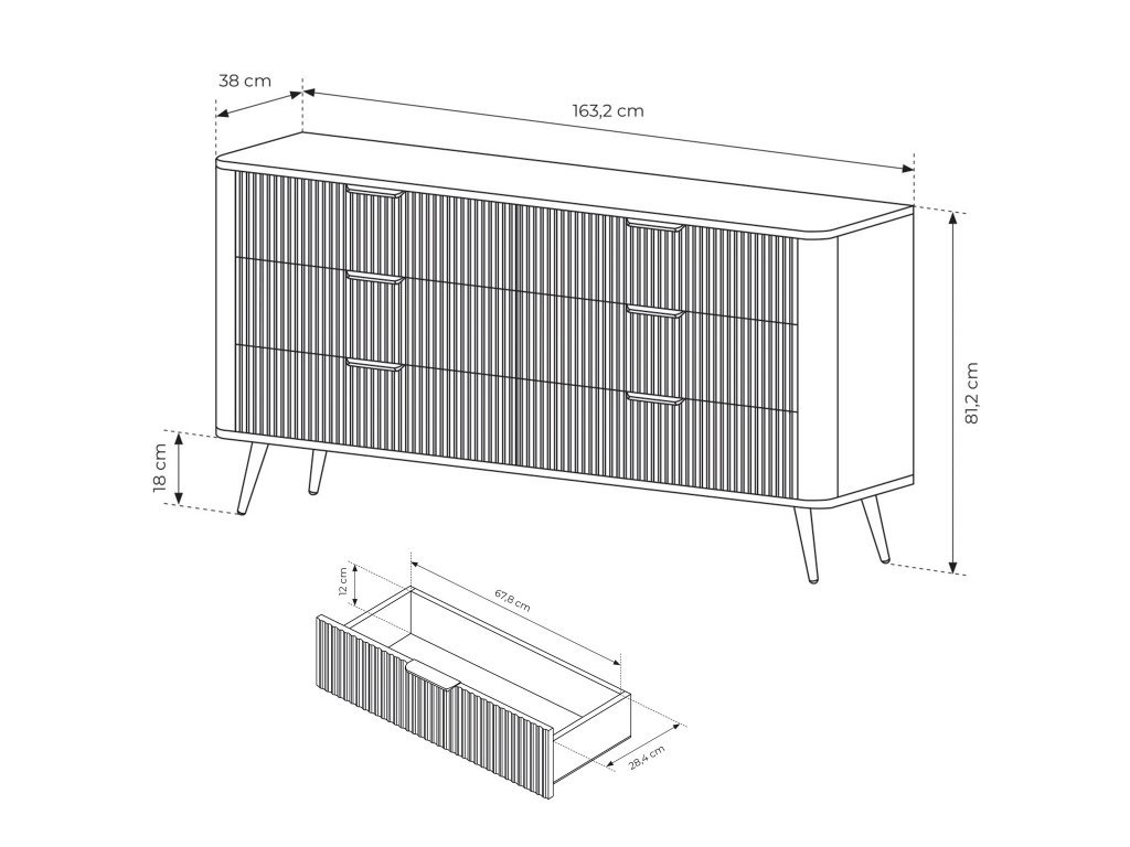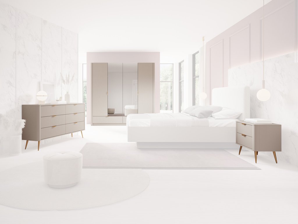 A LANTE bútor családba tartozó bútorok gyönyörű bézs színváltozatokban készülnek, amelyhez társulnak a különleges bordázott előlapok. A fém lábak és fogantyúk arany színűek, melyeknek köszönhetően az egyes elemek igazán luxusos hatást keltenek. A lekerekített élek garantálják a biztonságosságát és a szofisztikált megjelenését. Az összes bútordarab minőségi MDF, HDF és laminált bútorlapból készültek. A megválasztott anyagoknak hála garantálva van a bútor ellenálló képessége és stabilitása, így biztosan hosszú élettartammal rendelkeznek majd. Számos bútor elemet tartalmaz, amelyek mindegyike praktikus tároló hellyel van ellátva.