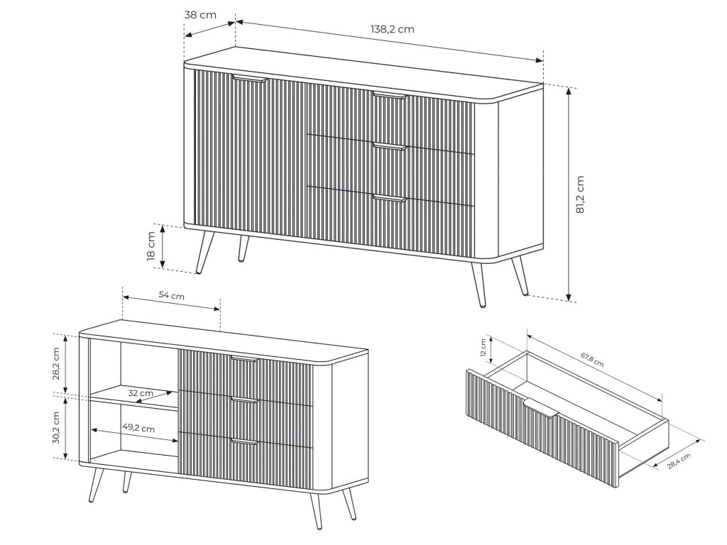 - LANTE 138 D3S komód: három fiókot és polcos szekrényt tartalmaz, amelyek tárolóhelyként szolgálnak. Méret (SzéxMaxMé): 138,2 x 81,2 x 38 cm