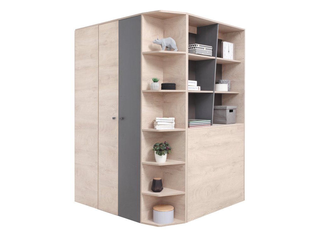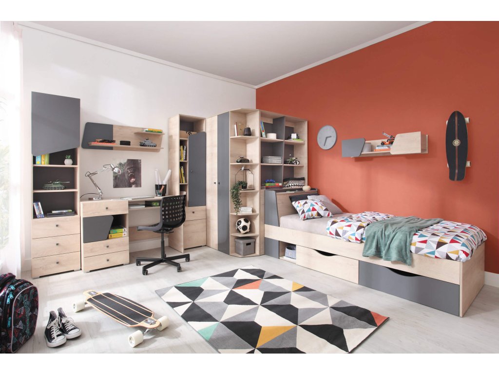 A LARA bútor szett remek választás a gyerekszobába vagy az ifjúsági szobába. A gyerekek az idejük nagy részét a szobájukban töltik. Hozzon létre nekik egy biztonságos és szép környezetet, ahol jól érzik majd magukat. A LARA bútor kollekció rendkívül praktikus, számos tároló hellyel, nyitott polccal és fiókkal rendelkezik, ahová gyermeke elhelyezheti a ruháit, játékait, könyveit. A bútor összeállítás több darabból áll, így Ön válogathatja össze ízlése szerint, hogy mire van szüksége és mi az ami elfér a szobába. A bútor minőségi laminált 16 mm vastag DTD bútorlapból készült. A tölgy fa utánzatának az antracit színnel való kombinációja univerzális, minden szobába illik. A kiegészítők megválogatásával a bútorral lányos és fiús szobát is be lehet rendezni.