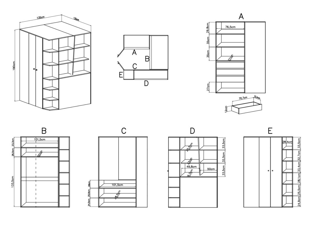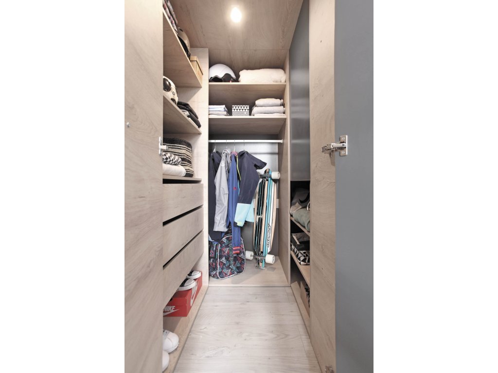 Nagy sarok ruhásszekrény, amely gardróbszekrényként használható. Az ajtók kinyitásával be lehet lépni a szekrénybe. A gardróbszekrény fiókokkal (az alsóneműnek), akasztóval és 9 polccal rendelkezik. Lehetőség van a szekrény belsejébe LED világítás vásárlására, amely az ajtó kinyitásával meggyúlik, becsukásával elalszik.