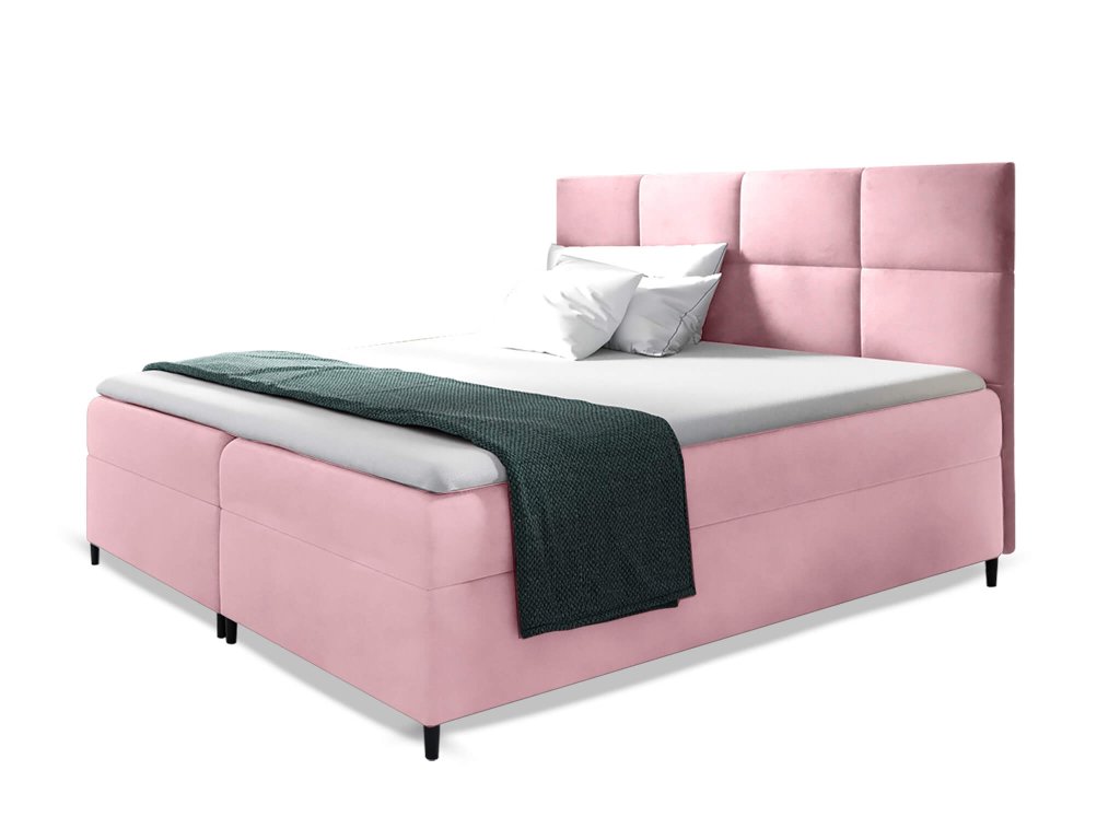 Stílusos és modern bársonyos rózsaszín szövettel kárpitozott Leila ágyneműtartós boxspring ágy, amely tökéletes választás minden hálószobába. Az ágy luxusos kinézete még a legigényesebb vásárlók elvárásainak is megfelel. Az időtálló designt praktikus fekete fa lábak egészítik ki. A Leila kontinentális ágy ágyneműtartóval is rendelkezik. A két ágyneműtartó tároló rugós rendszerrel nyitható. Az ágy beépített matracokkal és ágyráccsal is rendelkezik. A matracok minőségi Bonell rugókból és magas rugalmasságú T30-as habból állnak. A Bonell rugók a leginkább használt rugók a matracok gyártására, amelyek biztosítják a matracban a szellőzést is. Specifikus formájuk és erejük van, amely megfelelő alátámasztást biztosít terhelés esetén. A magas rugalmasságú T30-as hab megfelelő puhasággal, rugalmassággal és hosszú élettartammal rendelkezik. A fedőmatrac (Topper) magas rugalmasságú habból készült, amely reagál a test hőjére és minden mozdulatára. Rugalmasságot és puhaságot biztosít, melynek köszönhetően kényelmesen tud pihenni az egész éjszaka során. A Topper 5 centiméter vastag habból áll és ajánlatos 2-3 havonta megfordítani. A levehető huzat cipzáras és mosógépben mosható 30 °C-on. A kidolgozott gyönyörű magas steppelt háttámlának praktikus előnyei is vannak, tökéletes szolgálatot tesz könyvolvasáskor vagy tévénézés közben. Az amerikai ágy magas, melynek köszönhetően könnyű róla lekelni.