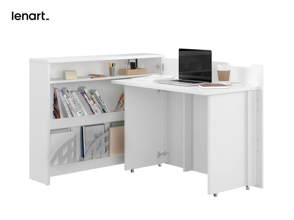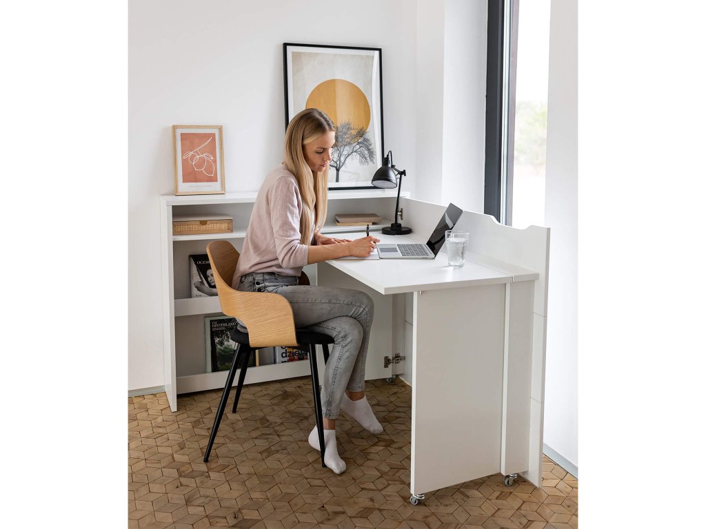 Praktikus fehér WORK CONCEPT kihúzható íróasztal mindenkinek, aki egy multifunkciós bútor darabot keres kisebb szobákba vagy egy egyszobás lakásba. Bár első látásra egy keskeny komódnak tűnik, könnyen kihúzható és átalakítható egy tágas íróasztallá polcokkal. Amennyiben néha otthonról dolgozik, biztosan értékelni fogja ezt a praktikus íróasztalt, amelyet csak akkor kell előhúznia, ha arra szüksége van. Egyébként pedig összecsukhatja és nem kell kerülgetnie.