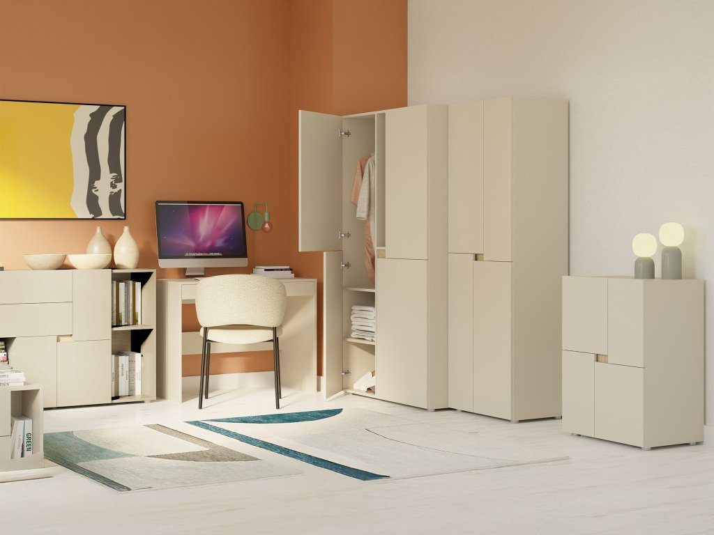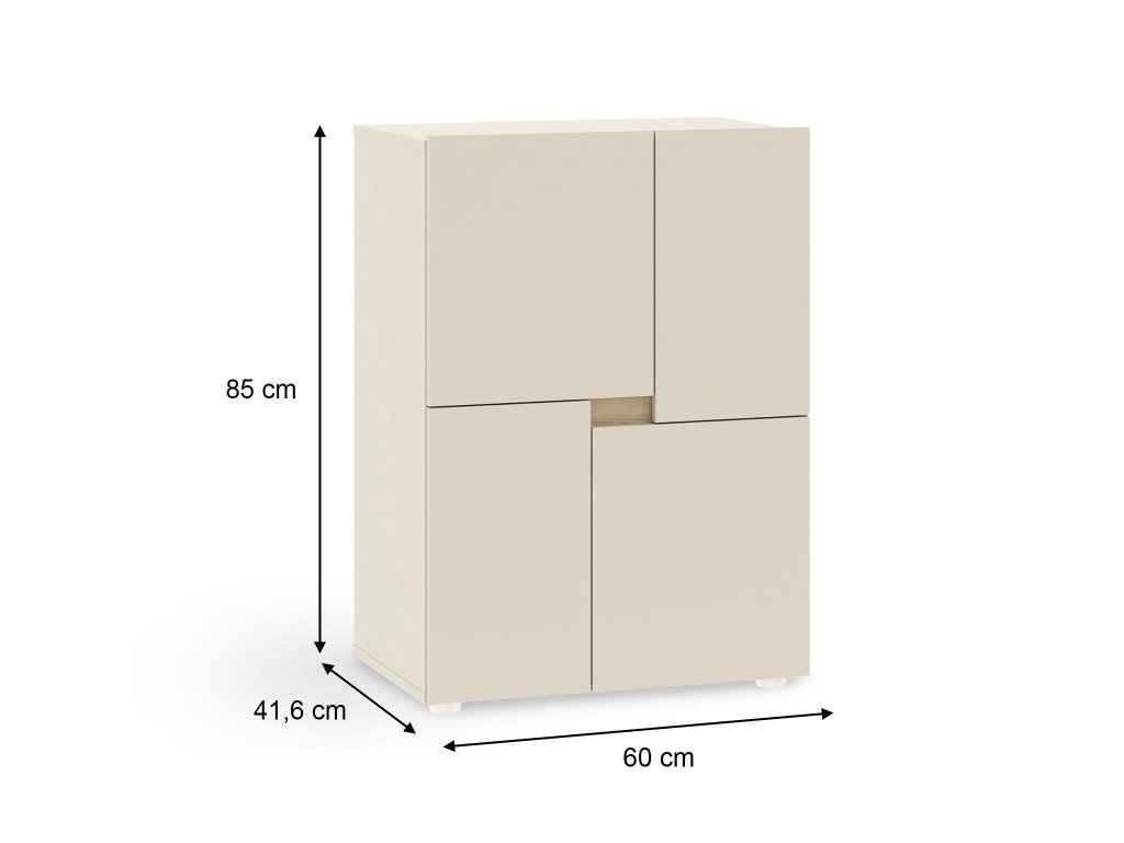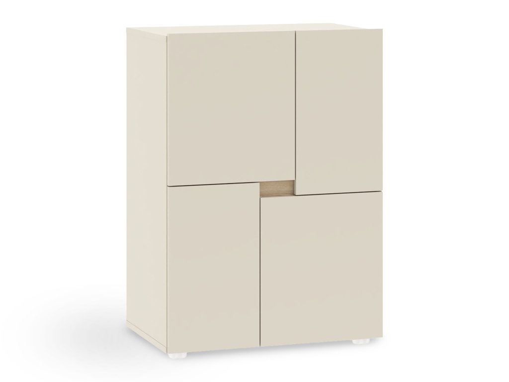 A Lens komód egy praktikus és stílusos bútordarab, amely kiválóan illeszkedik bármely gyerekszobába vagy tanulószobába. Elegáns kasmírszínben tervezték. A váz és a frontok minőségi, 16 mm vastag laminált forgácslapból készültek, látható ABS élzárókkal, amelyek megvédik a komódot a sérülésektől és meghosszabbítják élettartamát. A hátoldal él nélküli. A komód négy ajtóval rendelkezik, standard zsanérokkal és praktikus nyitórendszerrel, mely fogantyúk nélküli, egyszerűen az ajtók közötti réssel nyitható, ezáltal a bútor letisztult minimalista megjelenést kap. A komód belsejében egy tágas polc található az átlátható tároláshoz. A komódot kerek, ezüst színű műanyag lábak egészítik ki, amelyek biztosítják a stabilitást.