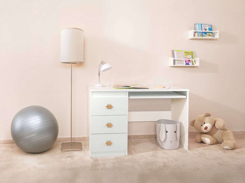 Szeretnénk Önnek bemutatni ezt a gyönyörű fehér LEO L1 íróasztalt, amely puzzle formájú fából készült fogantyúkkal rendelkezik, amely így tökéletes választást jelent minden gyerekszobába. Ez a modern és praktikus asztal tökéletes helyet biztosít a tanuláshoz. Elegáns matt felszíne igazán jó választás minden gyerekszobába. Minőségi fehér KRONO forgácslapból készül, amely az eleganciát egyesíti az ellenálló képességgel. Ezen kívül HRANIPEX PVC élzárással biztosított fehér színben, amely tökéletesíti a kinézetét. A kinézetén kívül igazán praktikus is. Három fiókkal van ellátva, amelyekbe elhelyezheti a szükséges iratait, eszközeit. Ez egy igazán megbízható és stabil íróasztal minőségi anyagokból. Gyártása során igazán ügyeltek a precíz kidolgozására. Az íróasztal számítógépes asztalként is használható, ugyanis praktikus kihúzható billentyűzettartóval is el van látva.
