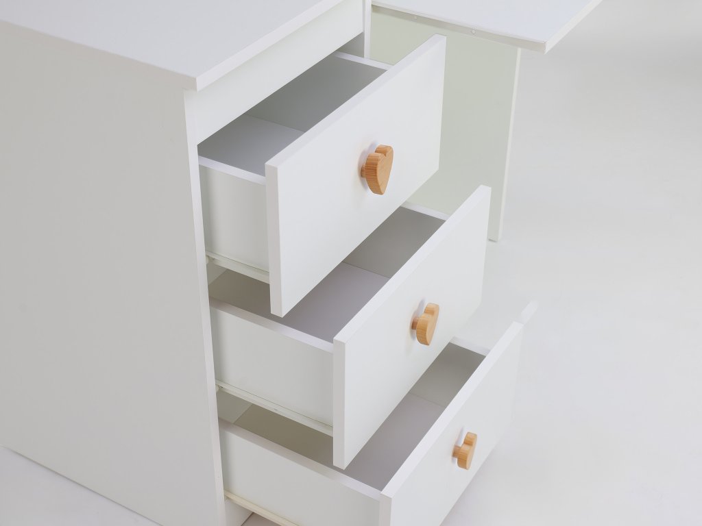 Ez a fehér LEO L1 íróasztal gyönyörű és egyedi szív formájú fából készült fogantyúkkal rendelkezik, amely így tökéletes választást jelent minden gyerekszobába. Ez a modern és praktikus asztal tökéletes helyet biztosít a tanuláshoz. Elegáns matt felszíne igazán jó választás minden gyerekszobába. Minőségi fehér KRONO forgácslapból készül, amely az eleganciát egyesíti az ellenálló képességgel. Ezen kívül HRANIPEX PVC élzárással biztosított fehér színben, amely tökéletesíti a kinézetét. A kinézetén kívül igazán praktikus is. Három fiókkal van ellátva, amelyekbe elhelyezheti a szükséges iratait, eszközeit. Ez egy igazán megbízható és stabil íróasztal minőségi anyagokból. Gyártása során igazán ügyeltek a precíz kidolgozására. Az íróasztal számítógépes asztalként is használható, ugyanis praktikus kihúzható billentyűzettartóval is el van látva.