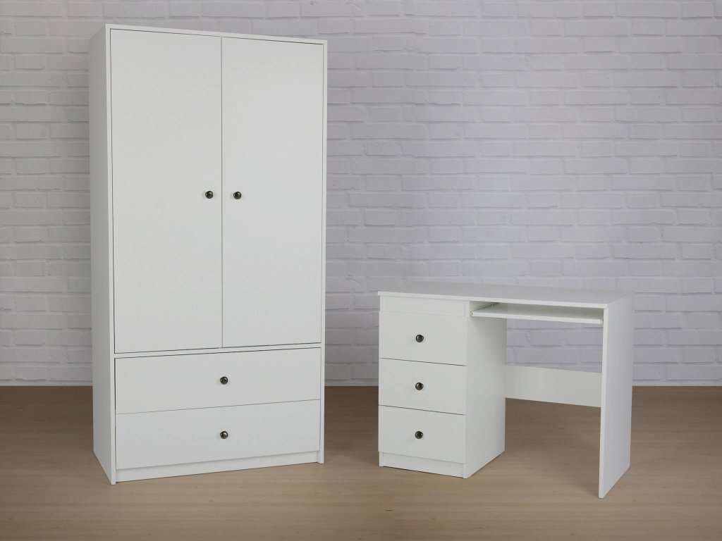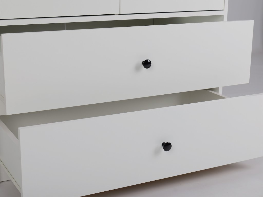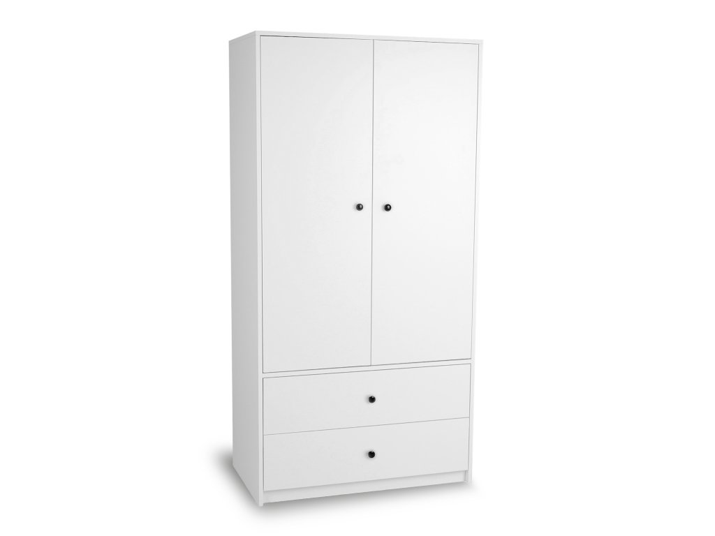 Fehér kétajtós LEO L2 ruhásszekrény. A semleges színben kapható szekrényt elegáns fényes fekete fogantyúk egészítik ki. Ha épp tárolóbútort keres a ruháinak, a LEO L2 szekrény ideális választás lesz a hálószobába, gyerekszobába vagy előszobába. Tartós KRONO forgácslapból készült. Tárolja ruháit és cipőit ebben a tágas szekrényben, és élvezze a rendet otthonában. Az aljában két tágas fiókot talál. A teteje két részre osztott, az egyik részben 3 praktikus polc, míg a másikban egy akasztórúd található. Az akasztórúd kiváló minőségű és erős, ami garantálja a legnehezebb ruhadarabok biztonságos felakasztását is. A szekrény elegáns bútorgombok segítségével nyílik, amelyeket kiválaszthat kínálatunkból. Több színváltozat is rendelkezésre áll. A szekrény hátlapja kemény farostlemezből készült, és innovatív csavarokkal van rögzítve, így biztosítva a maximális stabilitást és tartósságot. A 180 cm-es magasságával és 90 cm-es szélességével ez a szekrény rengeteg tárolóhelyet kínál anélkül, hogy túl sok helyet foglalna a szobában. A szekrény kiváló minőségű ABS élekkel van biztosítva, amely eleganciát kölcsönöz az egész szekrénynek. A modern, mégis neutrális szekrény bármilyen belső térbe illik.