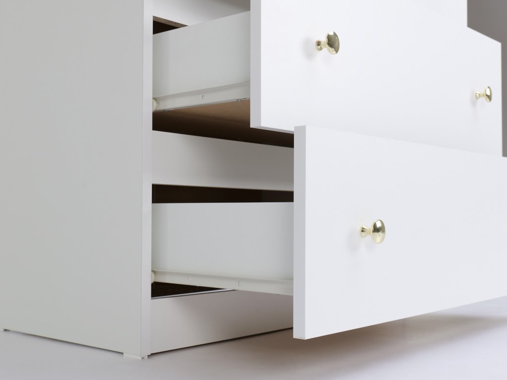 A komód fehér fogantyúkkal együtt kapható. A komódhoz különböző színváltozatokban vásárolhat fa vagy fém fogantyúkat.
