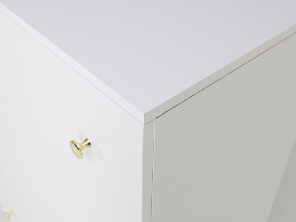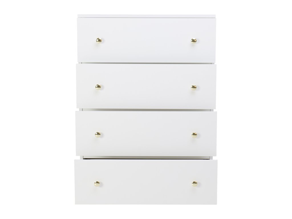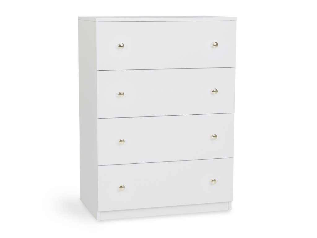 Négyfiókos minőségi és modern fehér LEO L4 komód, amely stílusos arany színű fogantyúkkal kapható. Ugyanolyan jól mutat az otthonában, mint az irodában. Ez a komód letisztult, modern designnal rendelkezik, így mindenki számára ajánljuk, aki praktikus és stílusos tároló helyet keres. A semleges fehér színének hála jól mutat a hálószobában, nappaliban vagy a gyerekszobában is. Ez az elegáns komód négy tágas fiókkal rendelkezik. Ez a praktikus design lehetővé teszi, hogy könnyen hozzáférjen a dolgaihoz, ruháihoz, irataihoz. Minőségi KRONO forgácslapból készül fehér HRANIPEX PVC szalaggal kiegészítve. A komód nem csak gyönyörű kinézettel rendelkezik, de igazán ellenálló is, ezzel is felkészülve a mindennapi használatra. Az L4 komód segít rendet tartani az otthonában, elegáns megjelenésével pedig a szoba éke lesz.