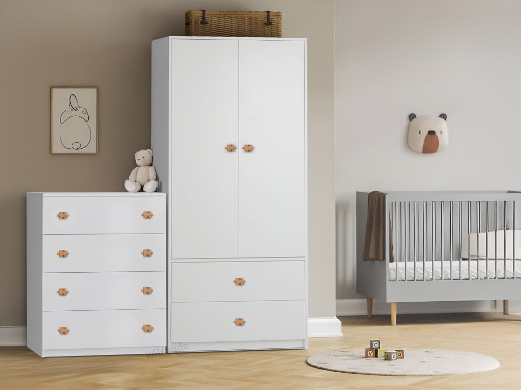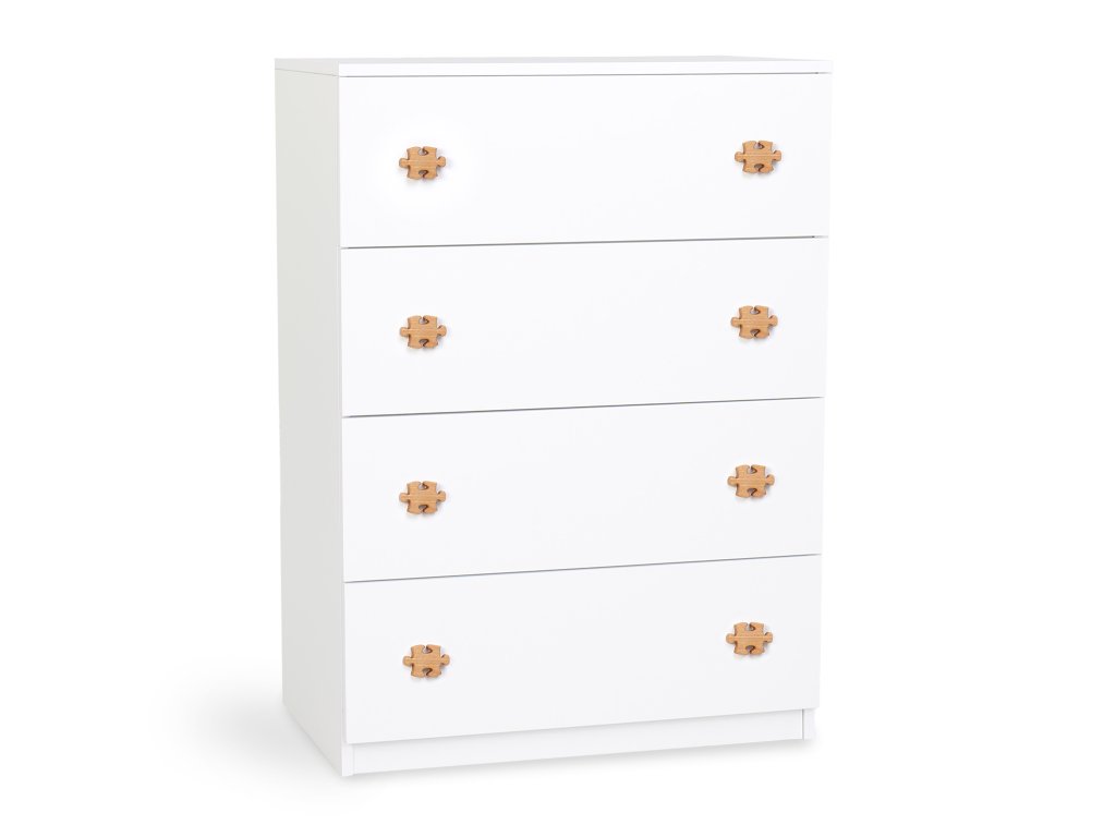 A puzzle alakú fából készült fogantyúkkal díszített minőségi és elegáns fehér LEO L4 komód tökéletes választás minden gyerekszobába. A gyerekek egyszerűen imádni fogják. Ez a komód letisztult, modern designnal rendelkezik, így mindenki számára ajánljuk, aki praktikus és stílusos tároló helyet keres. A semleges fehér színének hála jól mutat a majd minden gyerekszobában. Ez az elegáns komód négy tágas fiókkal rendelkezik. Ez a praktikus design lehetővé teszi, hogy könnyen hozzáférjen a dolgaihoz, ruháihoz, irataihoz. Minőségi KRONO forgácslapból készül fehér HRANIPEX PVC szalaggal kiegészítve. A komód nem csak gyönyörű kinézettel rendelkezik, de igazán ellenálló is, ezzel is felkészülve a mindennapi használatra. Az L4 komód segít rendet tartani az otthonában, elegáns megjelenésével pedig a szoba éke lesz.