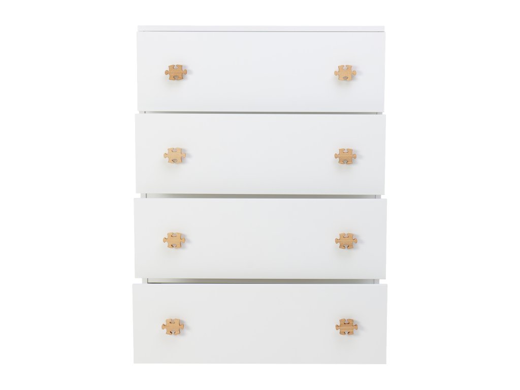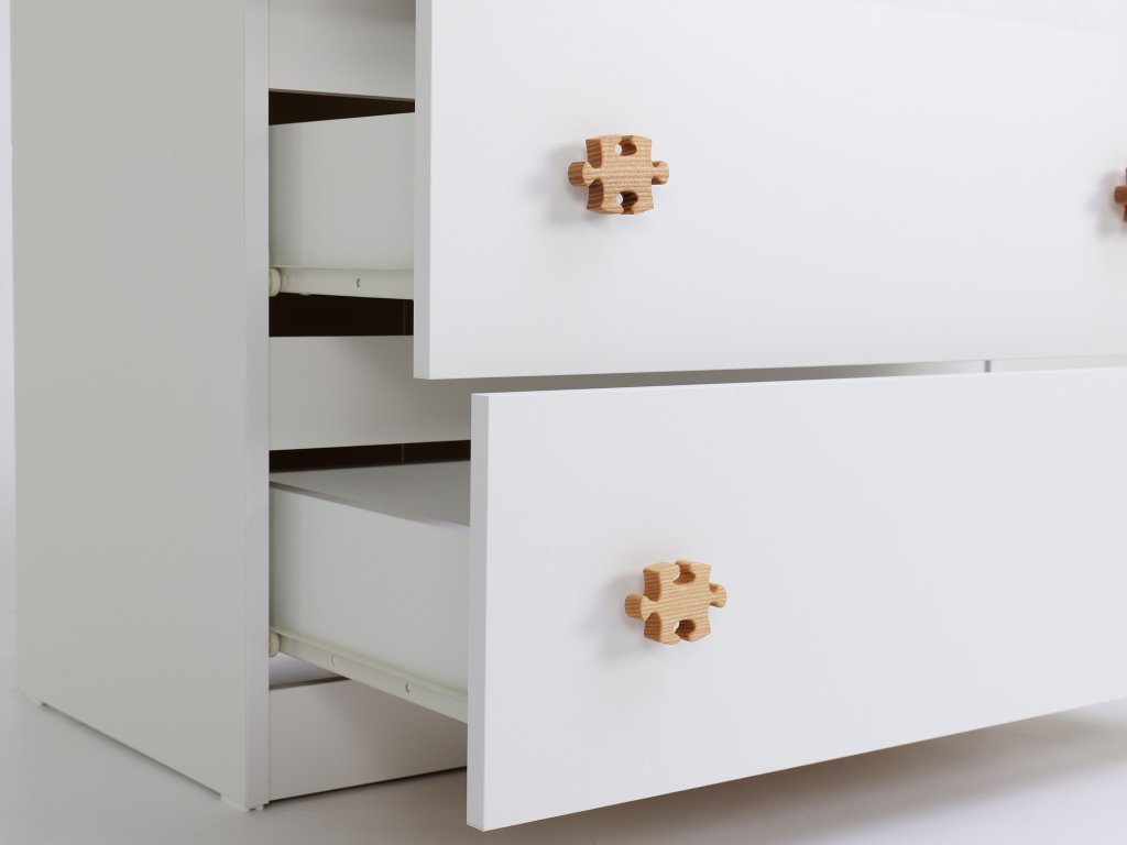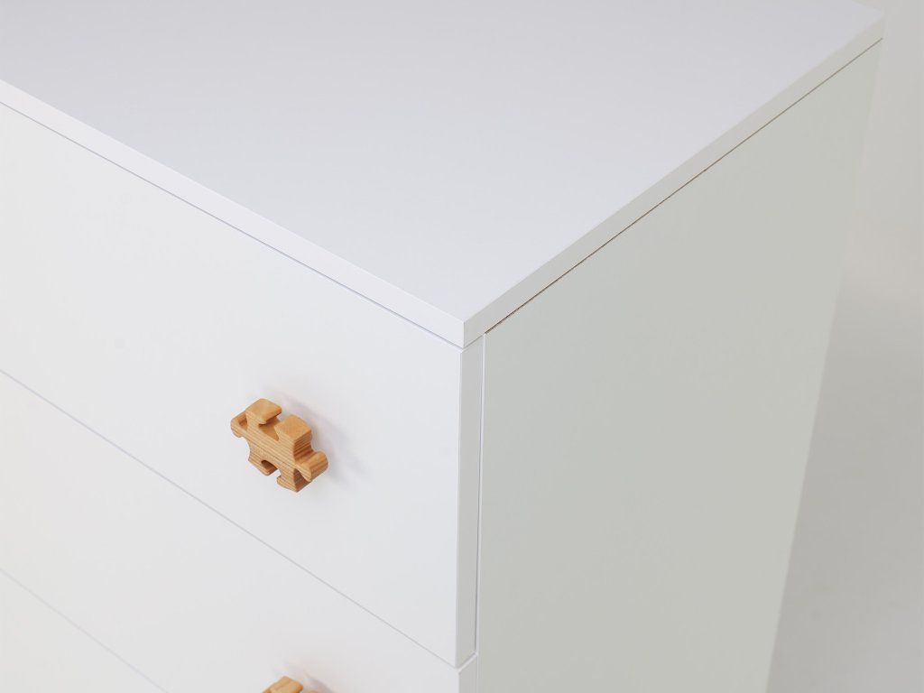 A komód fából készült puzzle alakú fogantyúkkal együtt kapható. A komódhoz különböző színváltozatokban vásárolhat fa vagy fém fogantyúkat.