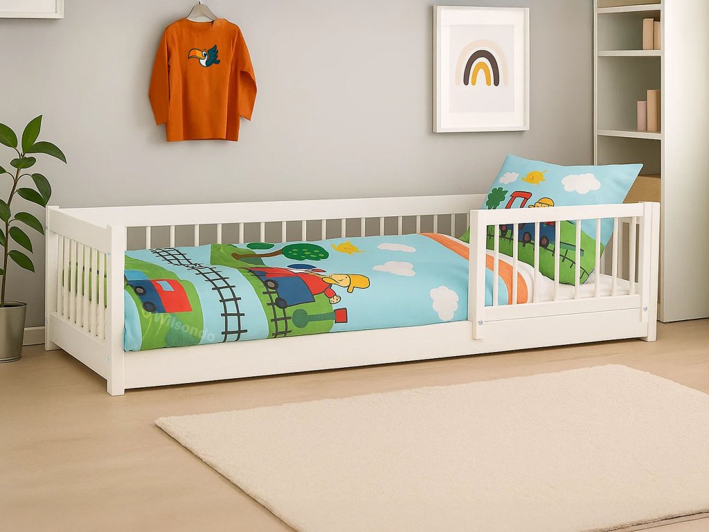 Fehér kivitelű Lesanka fa ágy ideális választás azoknak a szülőknek, akik minimalista és biztonságos darabot keresnek a gyerekszobába. Az alacsony, közvetlenül a padlóra helyezett szerkezetnek köszönhetően az ágy nagyon otthonos hatást kelt, és lehetővé teszi a gyermek számára, hogy teljesen önállóan keljen fel és feküdjön le. Ez a Montessori megközelítés alapja, amely már kicsi kortól támogatja a függetlenséget. A fehér felület emellett gyönyörűen világosítja a teret, és friss, tiszta megjelenést kölcsönöz a szobának, amely könnyen kombinálható bármilyen színű berendezéssel.