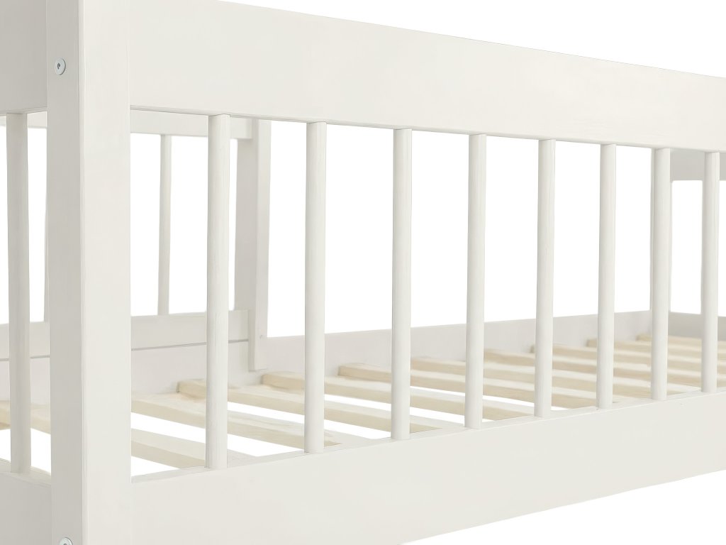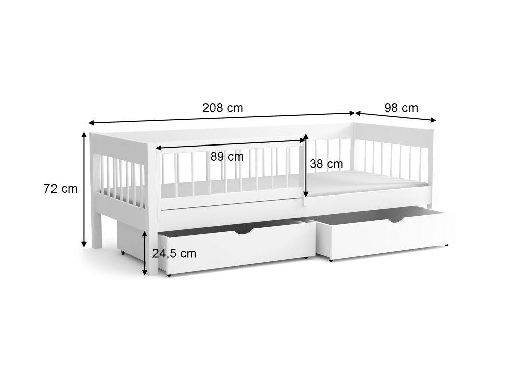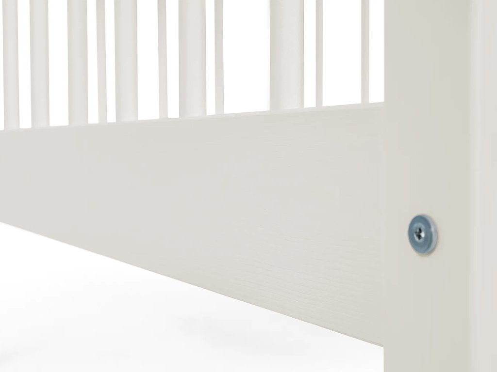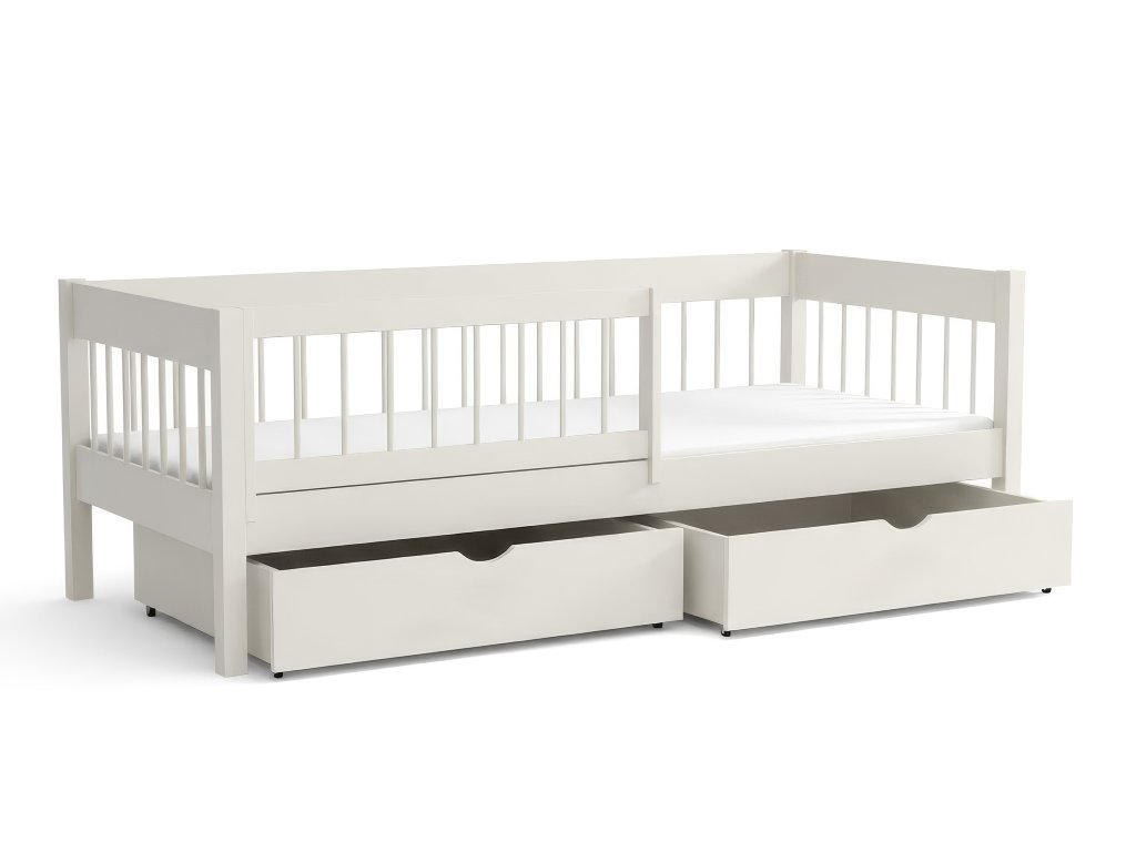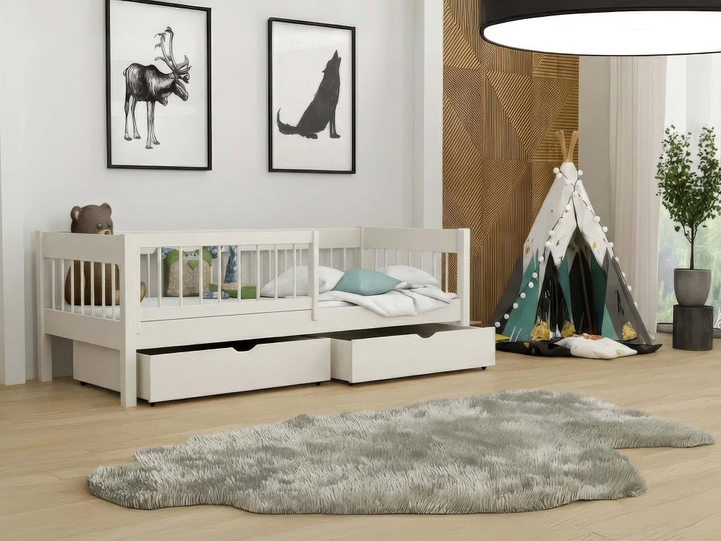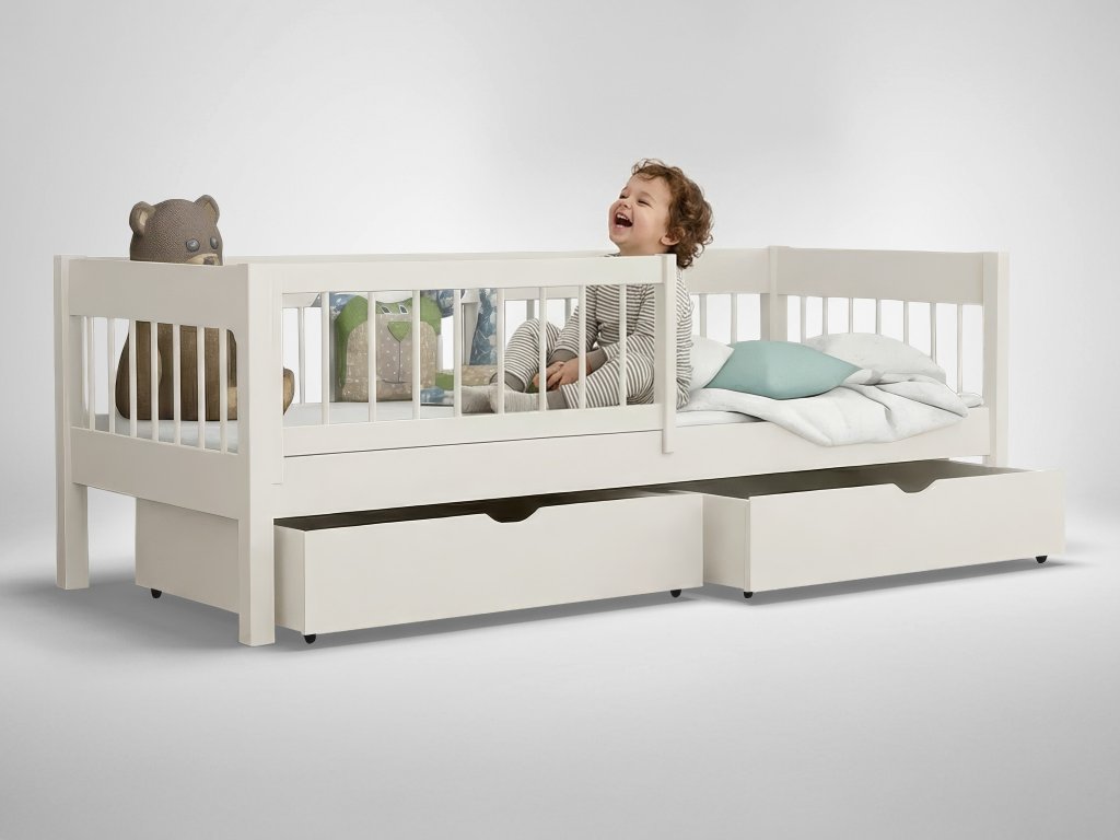 Az ágyhoz tartozik két praktikus ágyneműtartó tároló fiók, amelyek kerekeken mozgathatók. A csomag része továbbá a masszív ágyrács, valamint egy praktikus, levehető leesésgátló, amely az első időszakban extra védelmet nyújt. A leesésgátló később egyszerűen eltávolítható. A tömör fenyőfa szerkezetnek köszönhetően az ágy akár 120 kg terhelést is elbír, így ha gyermeke mellett szeretne feküdni az esti mesemondás vagy az elalvás előtt, gondtalanul megteheti.