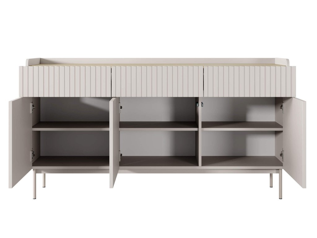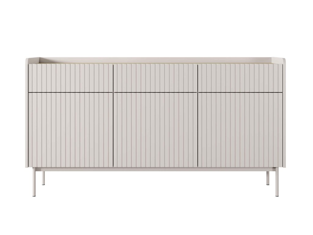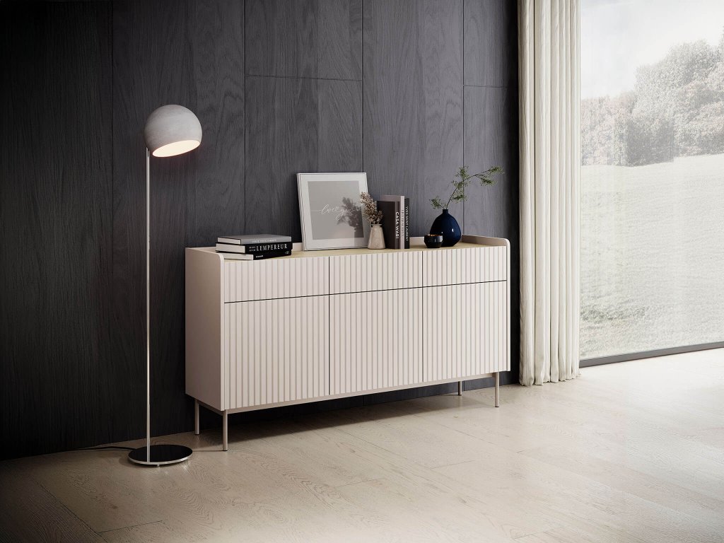 A három ajtós szekrénnyel és három fiókkal rendelkező széles komód jó választást jelenthet a nappaliba, az étkezőbe vagy a hálószobába is.