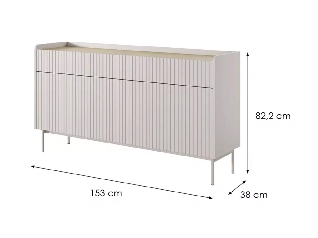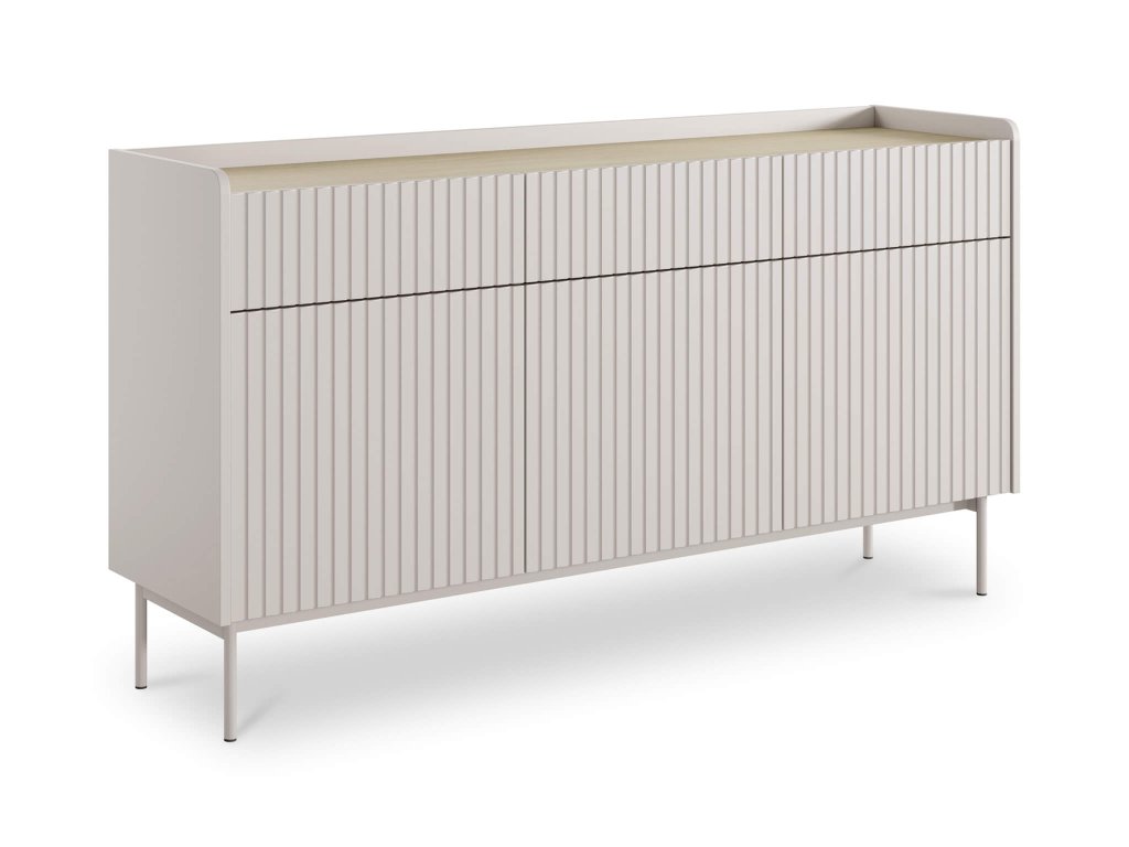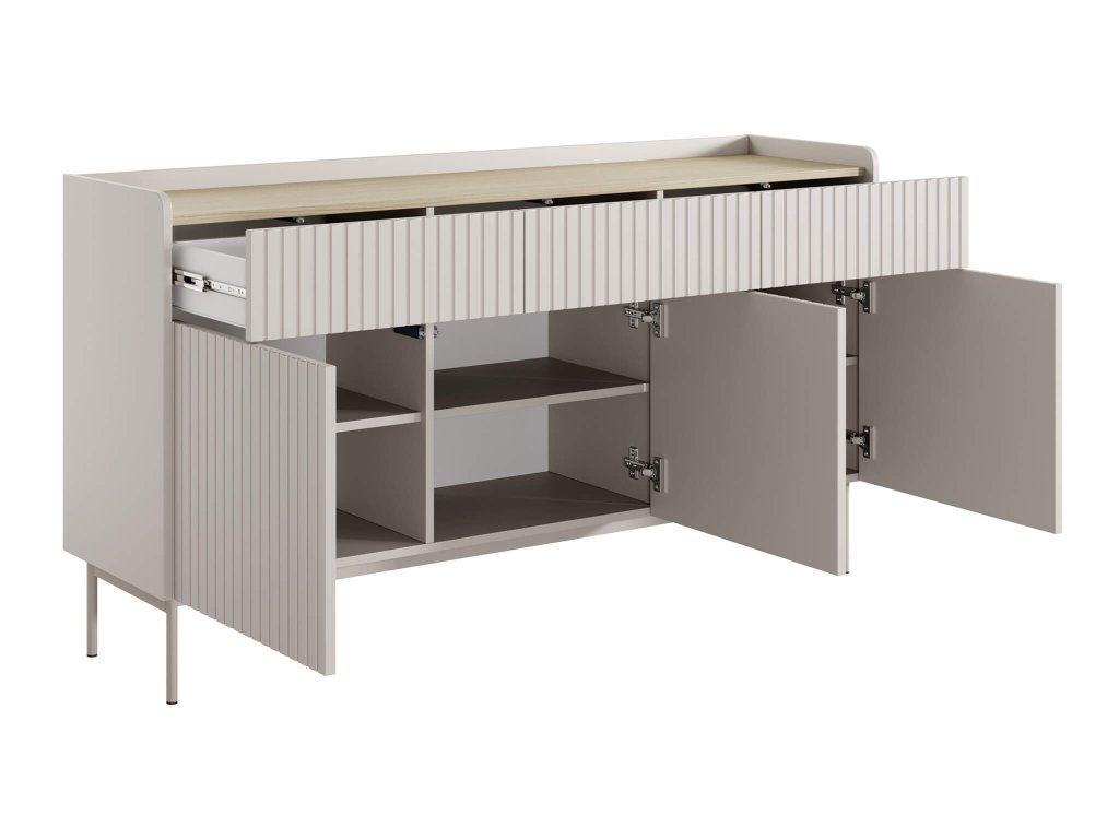 A bézs és scandi tölgy kombinációjában készült széles komód minimalista stílusban készül. Az elegáns LEVEL komód tökéletes kombinációja a funkcionalitásnak és a stílusnak. Ez a bútordarab igazán precíz megmunkálással rendelkezik, ellenálló és modern. Az ajtókon elhelyezett dupla ajtópántnak köszönhetően biztosítva van az ajtók problémamentes és könnyű nyitása. A fiókok teljesen kihúzhatók, melynek köszönhetően mindenhez kényelmesen hozzáfér. A komód minőségi 16 mm vastag E05-ös laminált forgácslapból készült, amely biztosítja a strapabíróságát és a hosszú élettartamát. Az előlapok ellenálló 18 mm vastag MDF-ből készülnek. Az élei ABS élzárással biztosítottak a bútor színében. A komód nem rendelkezik fogantyúkkal, push-to-open nyitási rendszerrel van ellátva. A komód kecses bézs fém lábakon áll, melyeknek köszönhetően könnyen fel tud mosni alatta.