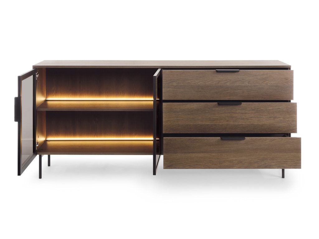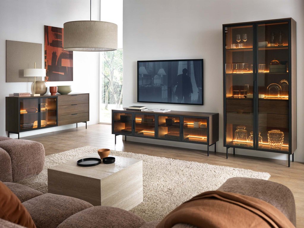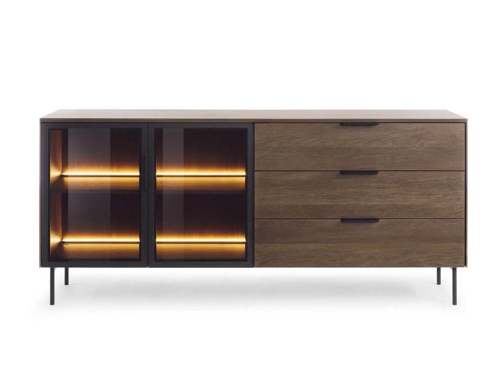 A LIMU 181 2D3S vitrines komód három praktikus fiókkal és egy kétajtós szekrénnyel rendelkezik. Matt Dunin tölgy színben készül fekete elemekkel kiegészülve. Az ajtók edzett biztonsági üvegből készültek, fekete MDF kerettel, amely kifinomult, modern karaktert ad a bútornak. A kétajtós vitrin belseje praktikus polcokat rejt. A beépített meleg fehér LED-világítás kellemes hangulatot teremt, és szépen kiemeli a kiállított dekorációkat vagy üvegtárgyakat.