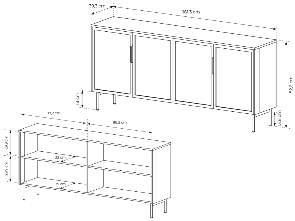 A LIMU 181 4D négyajtós komód matt Dunin tölgy színben készül fekete elemekkel kiegészülve. Az ajtók edzett biztonsági üvegből készültek, fekete MDF kerettel, amely kifinomult, modern karaktert ad a bútornak. A belseje praktikus polcokat rejt. A beépített meleg fehér LED-világítás kellemes hangulatot teremt, és szépen kiemeli a kiállított dekorációkat vagy üvegtárgyakat.