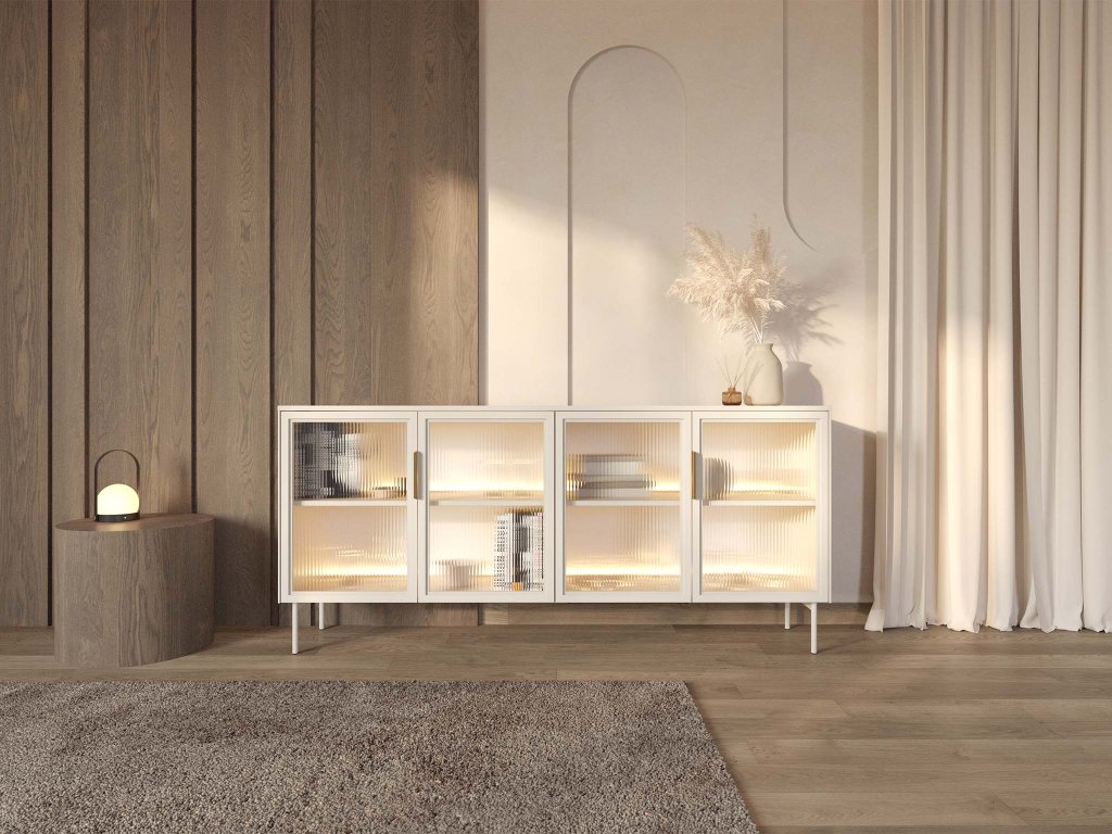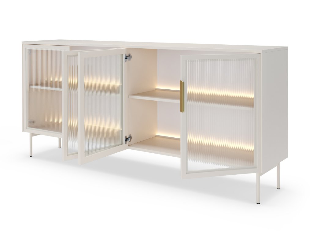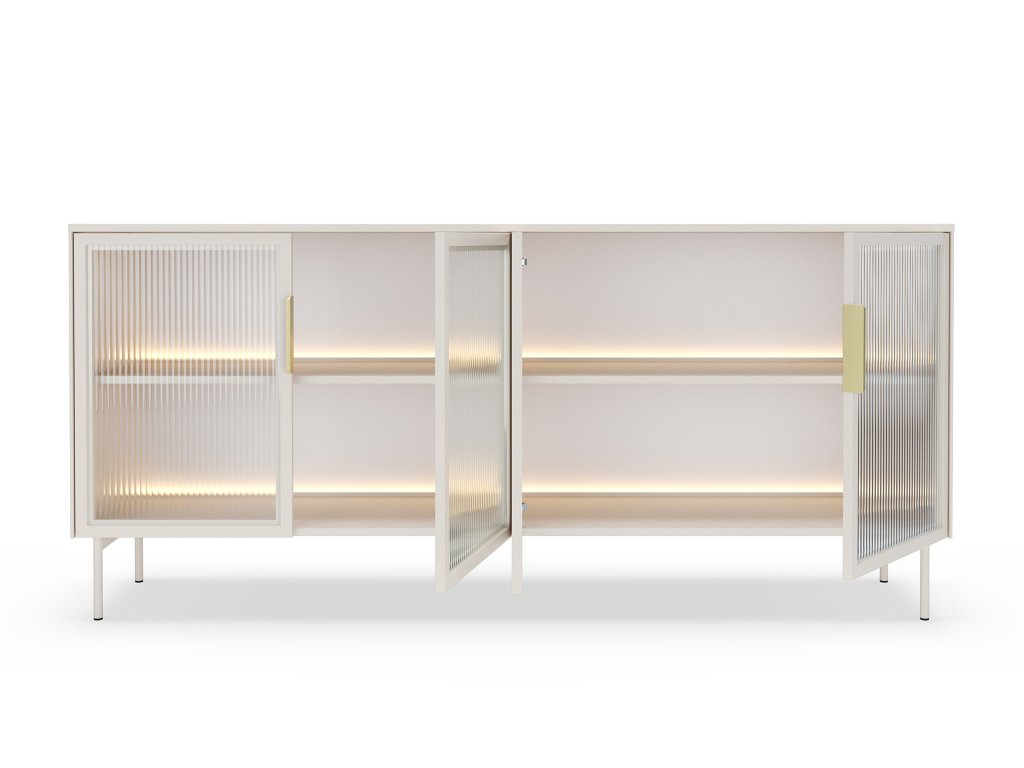 A kasmír színű széles LIMU 181 4D négyajtós komód arany színű fogantyúkkal kiegészülve minden szoba dísze lesz. Az ajtók edzett biztonsági üvegből készültek, fekete MDF kerettel, amely kifinomult, modern karaktert ad a bútornak. A belseje praktikus polcokat rejt. A beépített meleg fehér LED-világítás kellemes hangulatot teremt, és szépen kiemeli a kiállított dekorációkat vagy üvegtárgyakat.