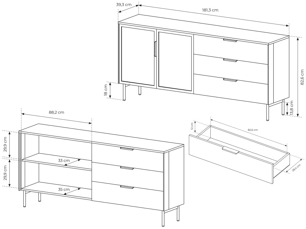 - Anyaga: MDF váz, ABS élzárás, laminált bútorlap, forgácslap / díszített edzett üveg / golyóscsapágyas fióksínek / fém lábak