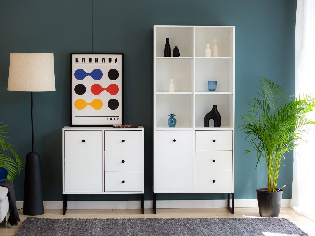 LINEA 1D3S polcos szekrény fehér színben, amely egy praktikus és gyönyörű kiegészítő minden modern otthonba. Ez a könyvespolc számos tároló hellyel büszkélkedhet. A szekrény alsó részében három fiók és egy ajtós szekrény kapott helyet, amely mögött egy polc helyezkedik el. A szekrény felső része praktikus könyvespolcként is használható. A fekete fém lábak porszórt festéssel kezeltek, stabilitást és elegáns megjelenést kölcsönöznek a bútornak.